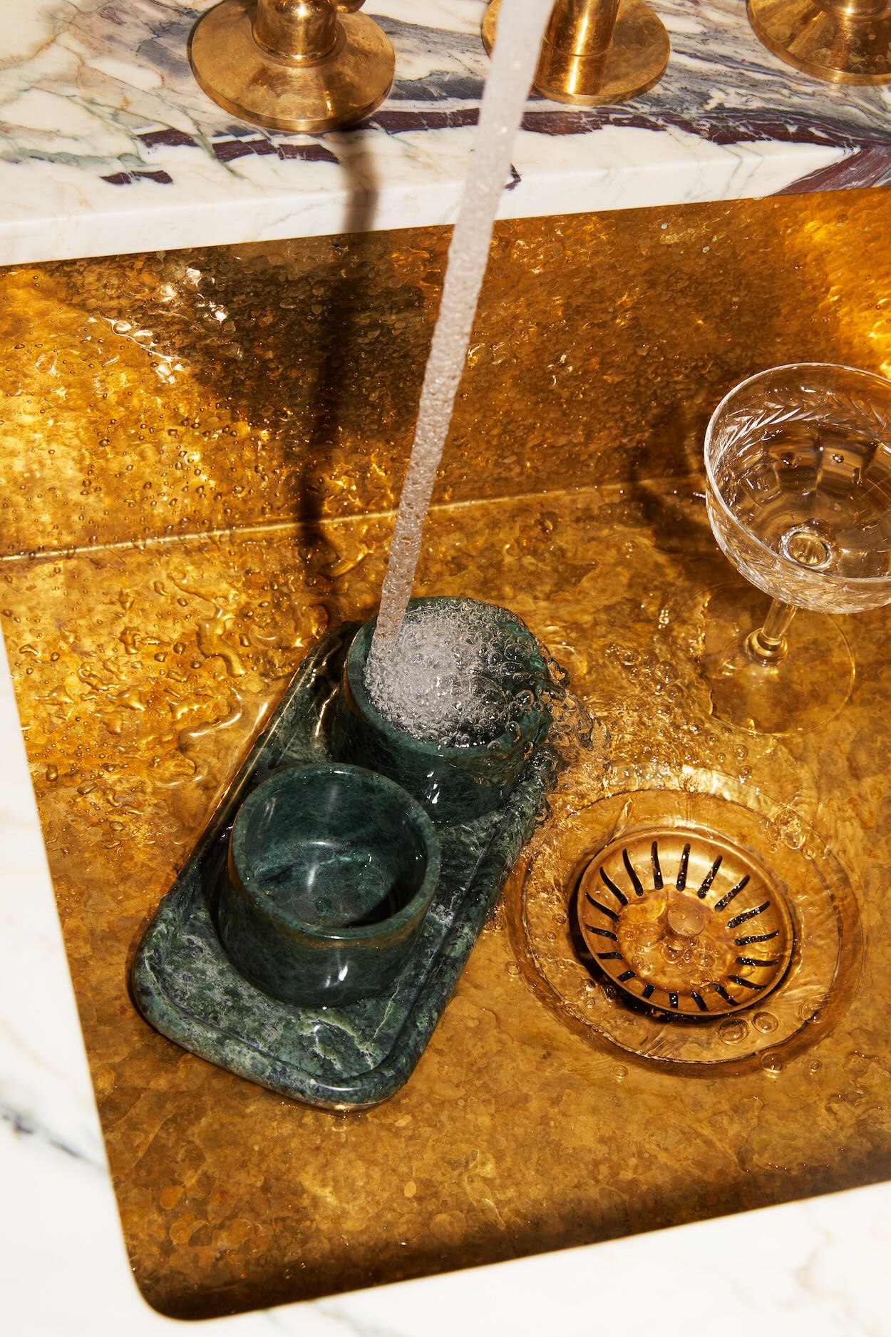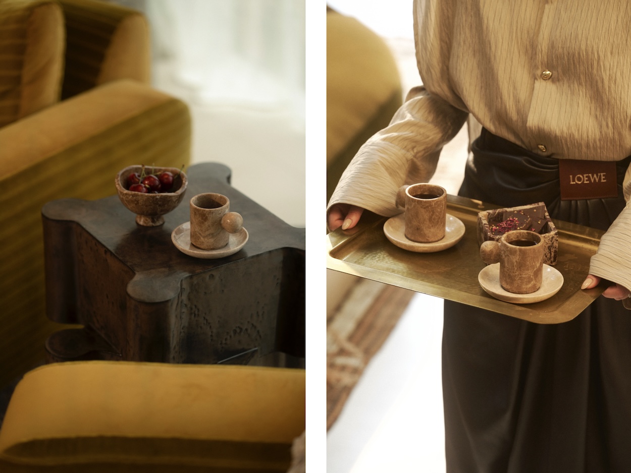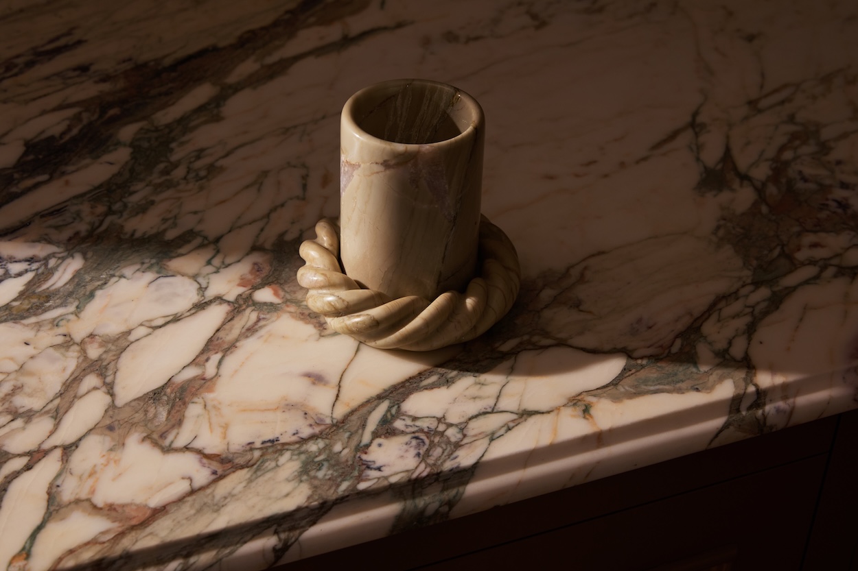 Last week, Anastasio Home released a ritual cup set with Crown Affair, designed to align with the brand’s new Overnight Repair Serum. “The cup and coaster set is a hand-carved marble vanity vessel to hold your hair brushes, clips, and jewelry,” Anastasio Holloway says. “They are so delightful to hold, that some have purchased up to four sets to be used to serve hot bone broth or tea. No matter the use, we want to make objects that sisters fight over at estate sales in 2095.”