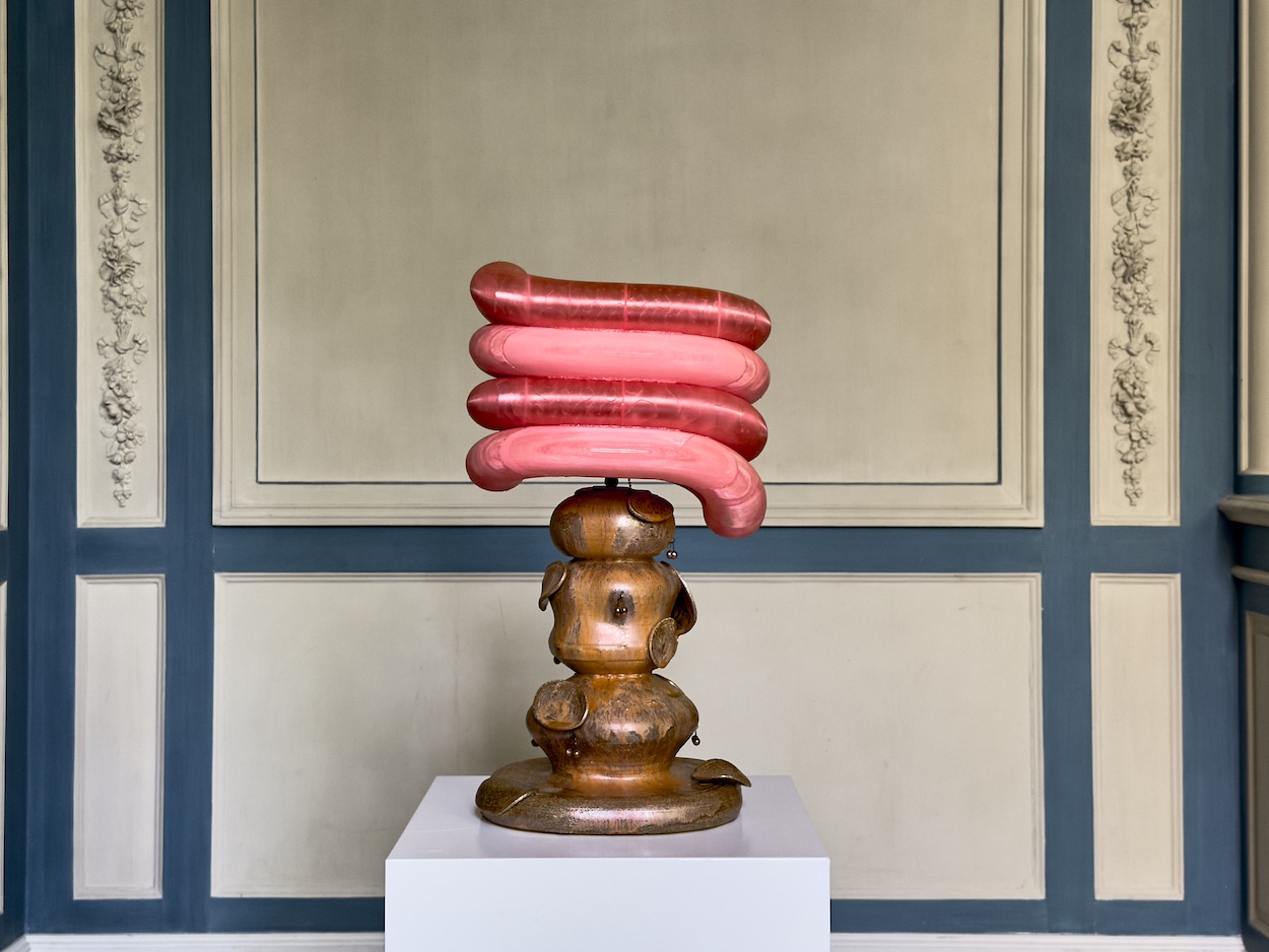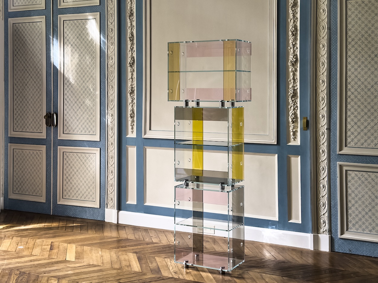 All designers created work specifically for the exhibition—from Han’s Noetrigram v0.9 mirror to Ngo’s Lantern Vessel in Between Worlds, inspired by Vietnamese silk lanterns, and her Table Lamp in Cherry Blossoms and Himalayan Salt. Marie et Alexandre manipulated glass into modular objects, and Campardo crafted a coffee table, which he designed to look like a block of butter.