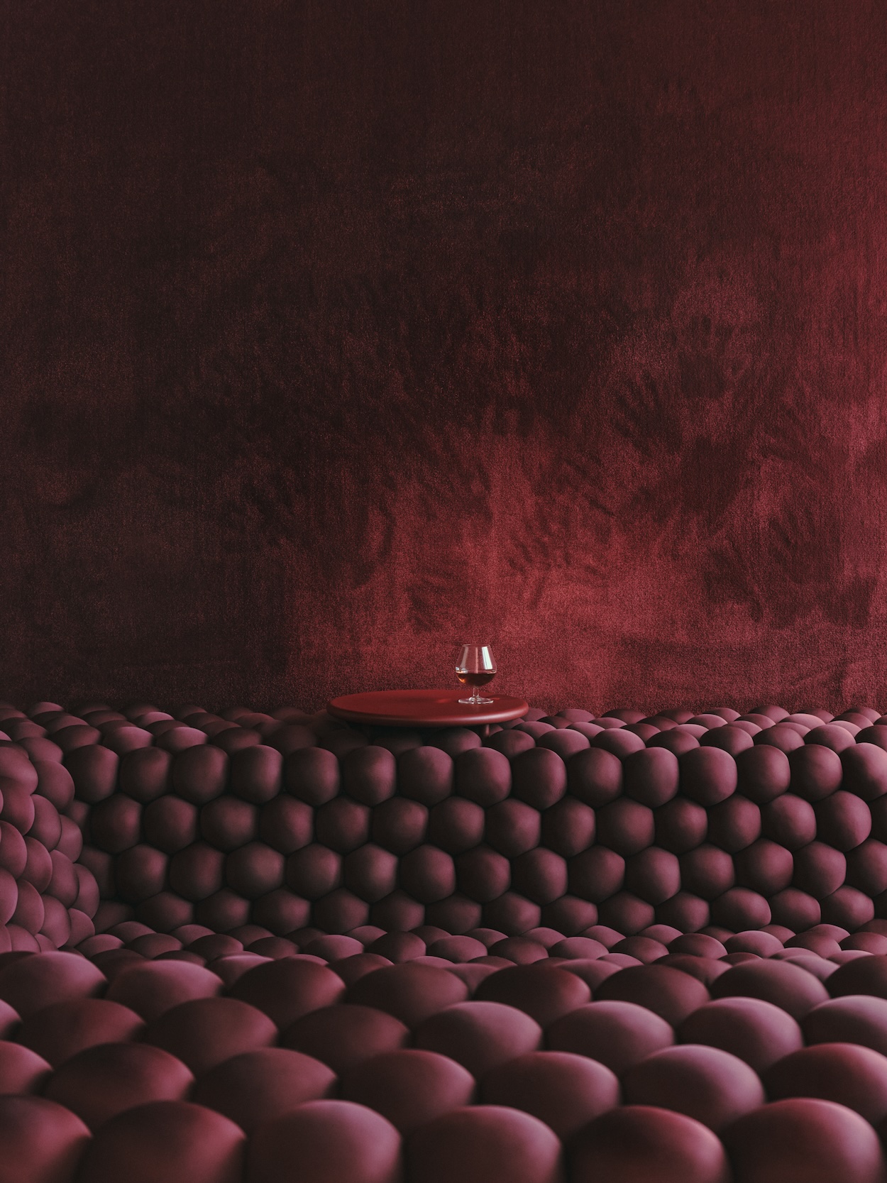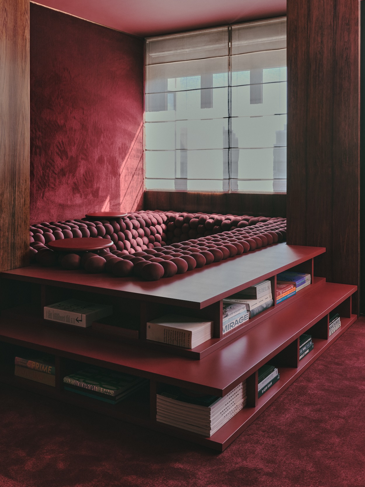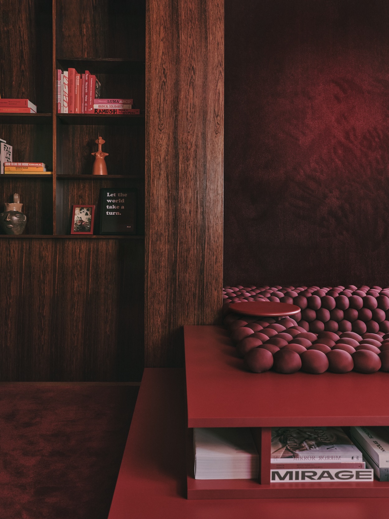 In a curator’s home in Brussels, GOLEM used it to line a convertible conversation pit, a space for lounging that can also be fit with a mattress as a guest bed. Set within a sunlit corner of a bedroom, the pit’s interior is reached by climbing two steps of open shelving that host a collection of oversized books. The furniture piece’s rational design and raspberry color were directly inspired by the home’s midcentury interior by late Belgian architect Jules Wabbes, but its function fills the current family’s varied needs.