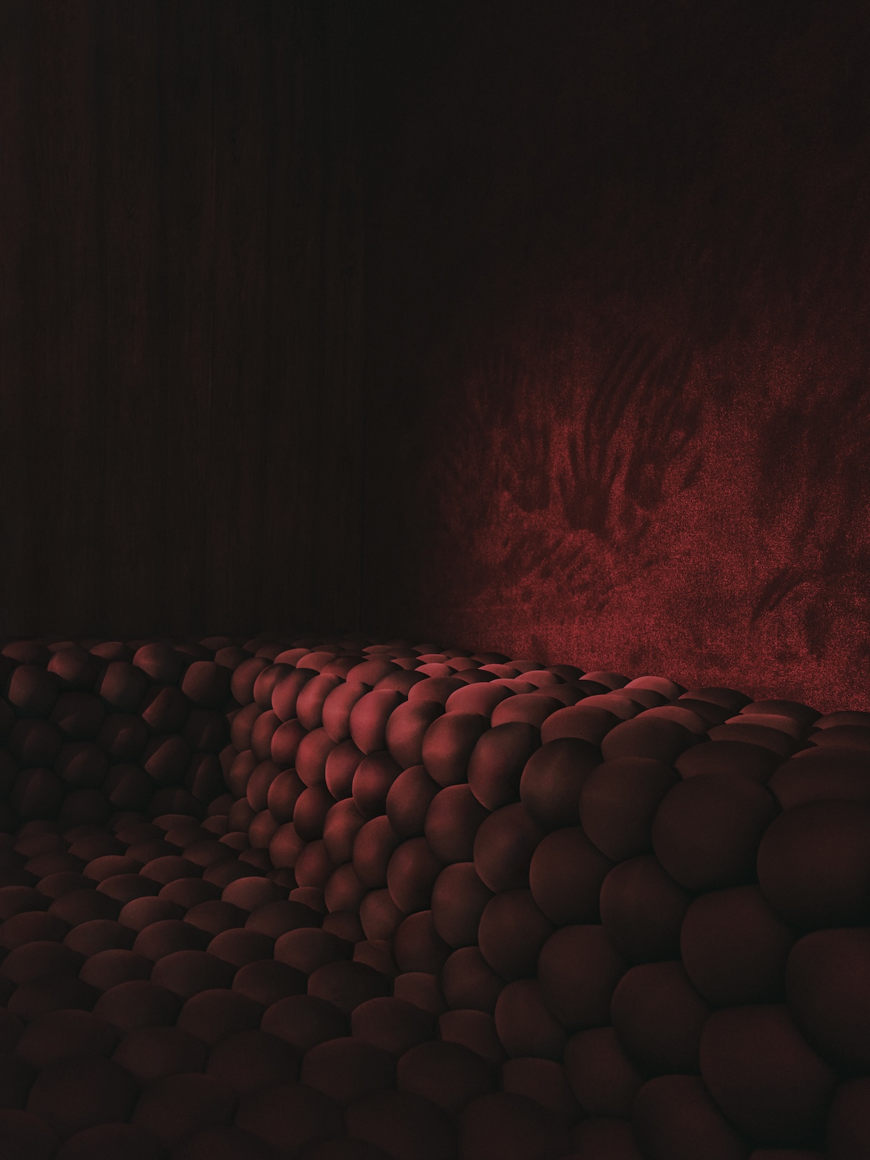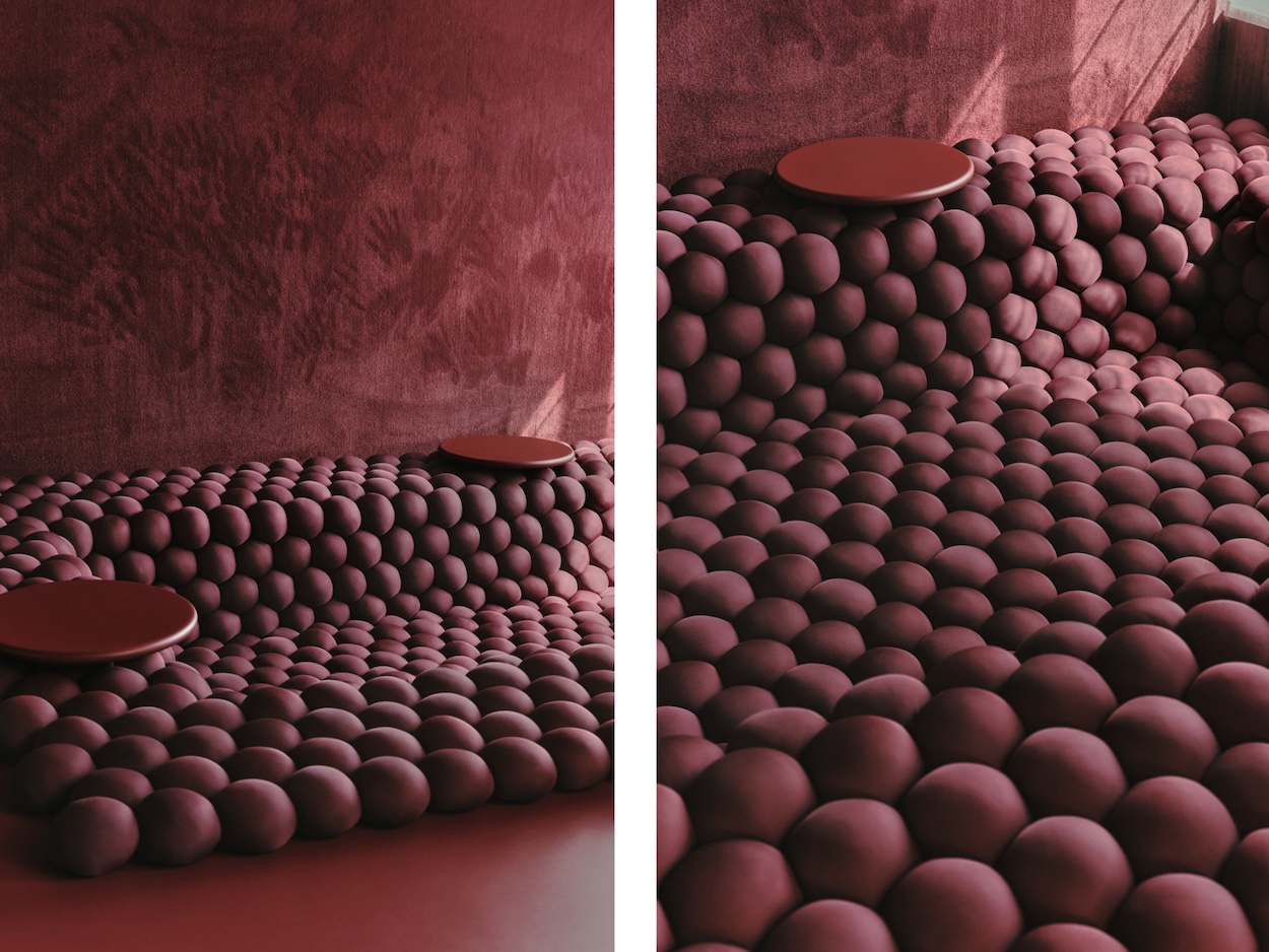 Each Amoreba ball is sized to fit the hand—and durable yet squeezable thanks to its interior of synthetic cotton and silicon fiber carefully sourced from France. Construction without the use of glue allows these components to be reused indefinitely while its parametric design offers endless customization of the size and shape of an Amoreba mat. When placed atop a structure or even the floor, Amoreba’s cushy, undulating surface offers both comfort and a cocooning effect.