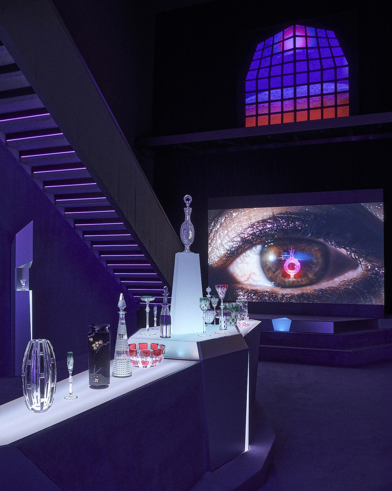 The protagonist “performers” move through what is Baccarat’s archive, portrayed as a “Crystal Crypt”—the installation’s title—benneath a cathedral. The activation marks the brand’s return to the citywide event after four years. In Baccarat, France—the luxury brand’s rural France seat—the main Eglise Saint Remy church is an early example of Brutalist Modernism. And yet, its stained glass windows were, naturally, produced by Baccarat.