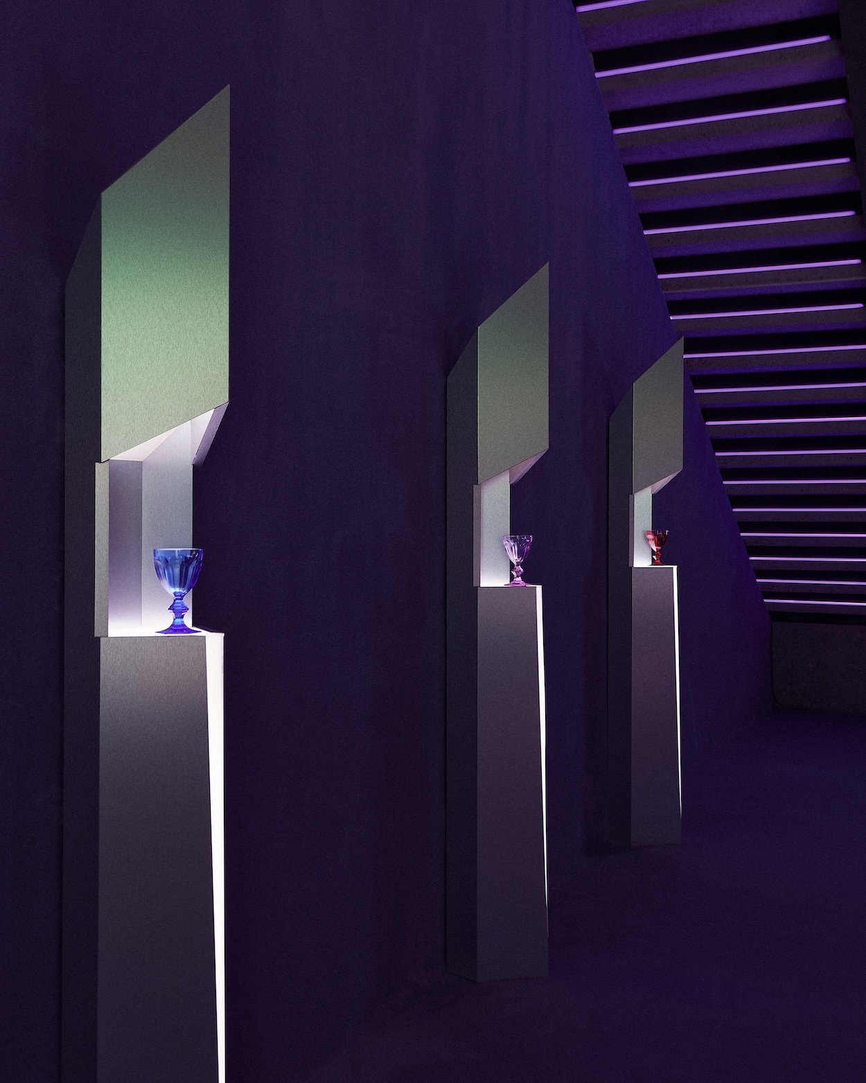The overall display takes on an otherworldly, space-age cosmodrome quality. In its sacred space dimension, it’s as a kind of “factory temple,” uncovered like an ancient monument. For Luciani, British designer Bethan Laura Wood’s modular Zénith chandelier—taking pride of place toward the rear of the space, is a kind of space ship, a mash up of different styles and techniques; at once Venetian and industrial. Also on display, on separate illuminated display modules, are new editions of Baccarat’s legendary scallop-form Harcourt 1841 glass, first produced for Emperor Napoleon III and Empress Eugénie.