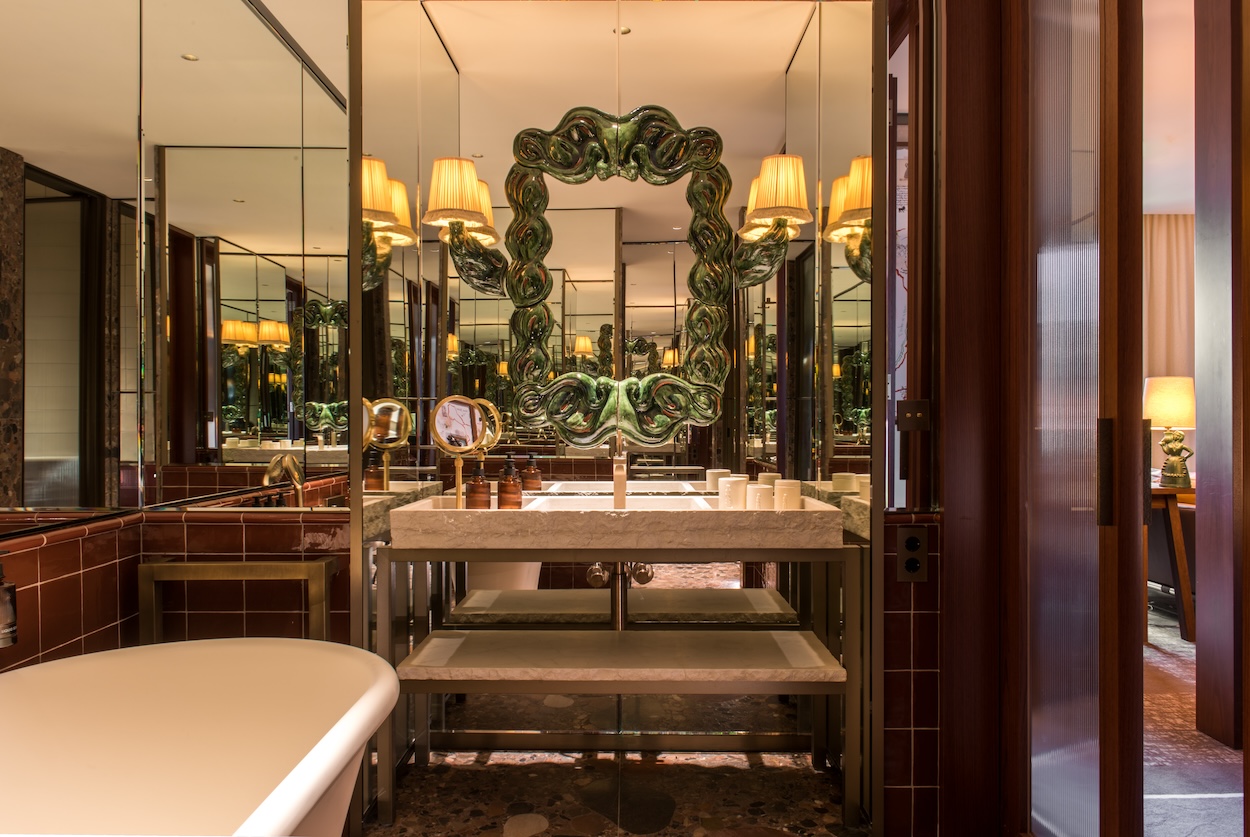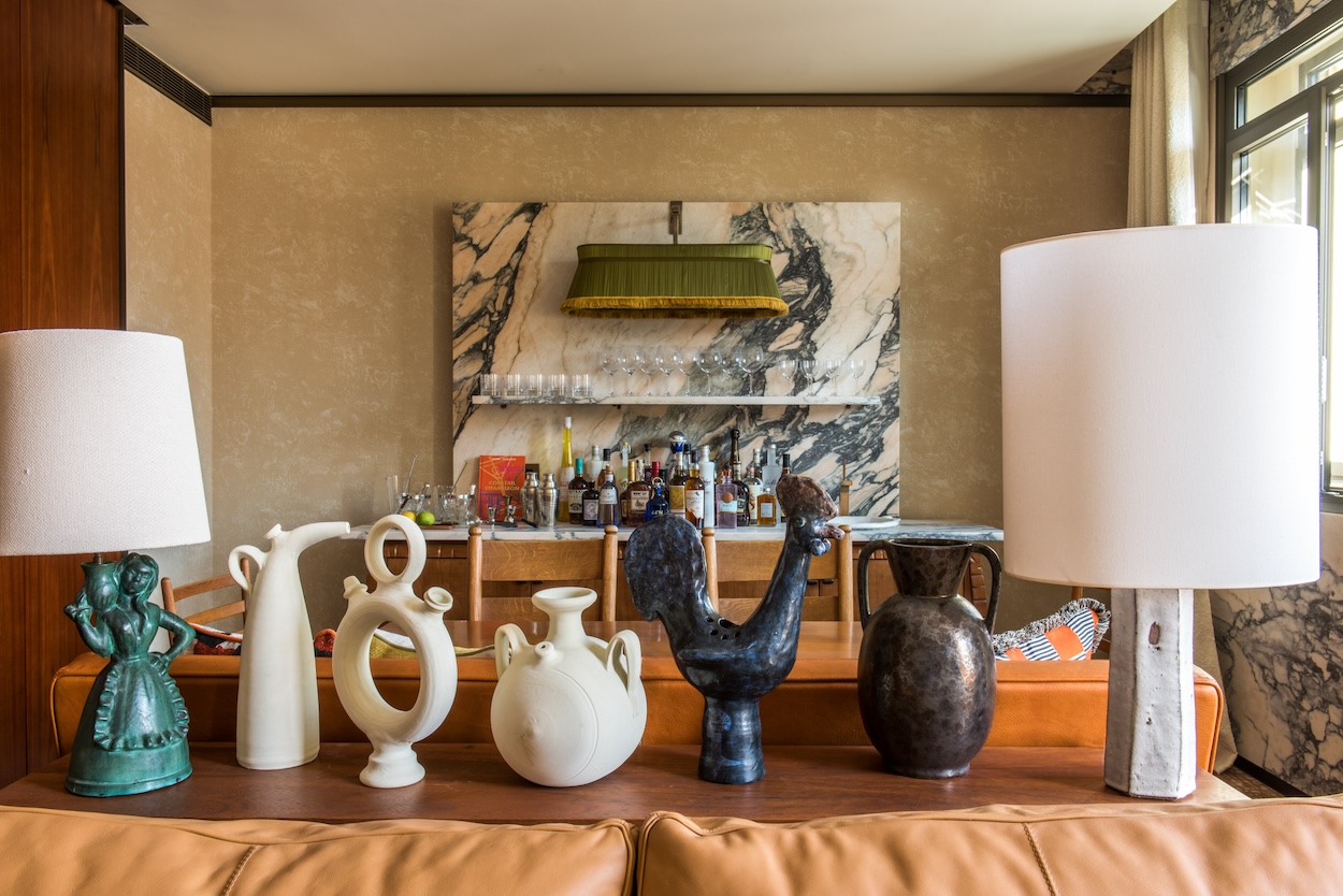 Standout Features: Starck’s warm approach to interiors unfolds across accommodations that evoke warmth and a distinct sense of place. The intentionally sourced art collection is rounded out by artifacts like a flamenco guitar, handwritten letters, and sculptures that tell the story of a Spanish couple whose romance, travels, and love for culture are at the center of Starck’s vision for the property. The overall effect, bolstered by touches like the soft diffusion of light from an ornately carved seahorse wall sconce and a captivatingly intricate glazed terracotta bathroom mirror, is more akin to staying in the guest cottage of a well-traveled friend.