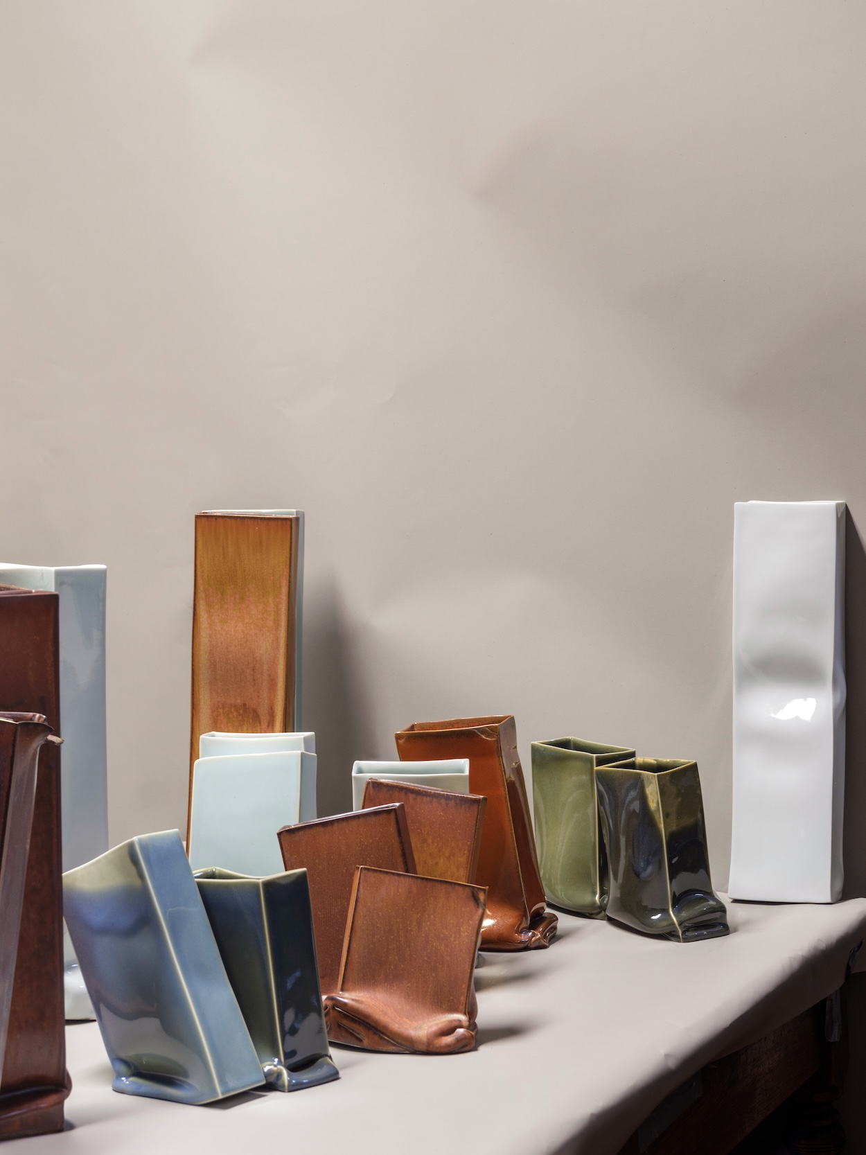 Also on view are his Vases, a series of “standalone” vessels in which porcelain truly acts on its own and becomes a boisterous protagonist in doing so. When fired in the kiln, these forms—originally scaled in the same uniform fashion as the other components mentioned before—crinkle and crumble under their own weight. “First firings were dramatic until I started to play with this very unpredictable behavior,” boos explains. “I fired the pieces close to one another and they would eventually kiss. Upon cooling, the glaze would hold them together, hence making them functional. But functionality remains ambiguous. It is this ambiguity that I am after. In it resides the diversity of ceramic practice between function and art.”