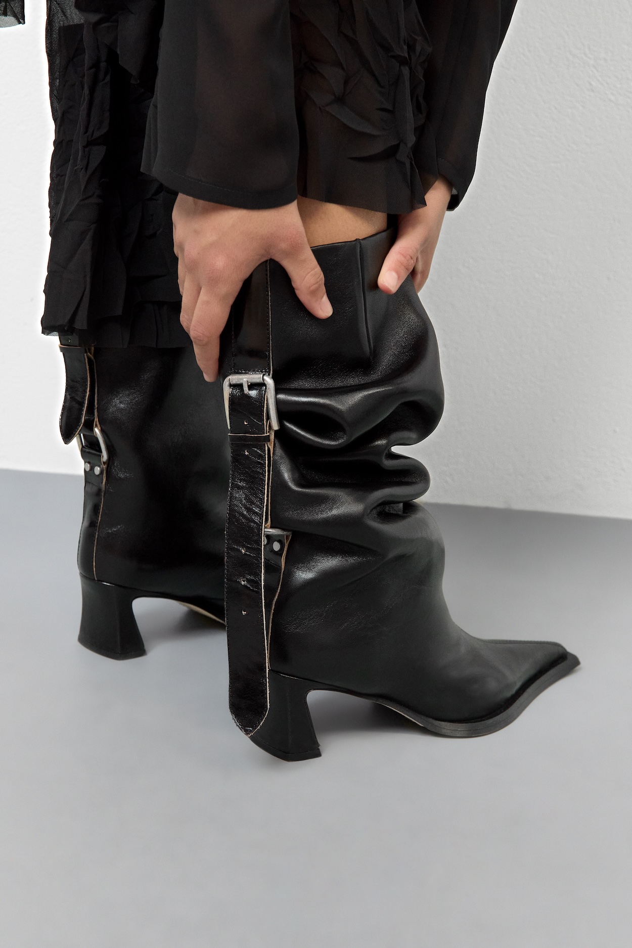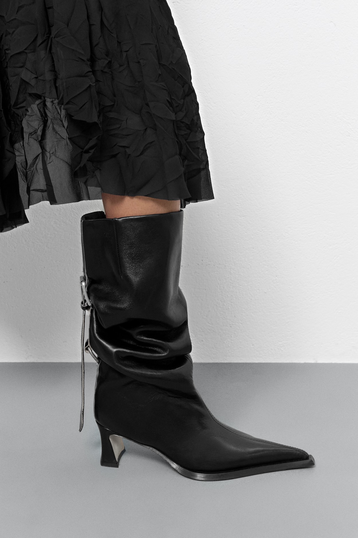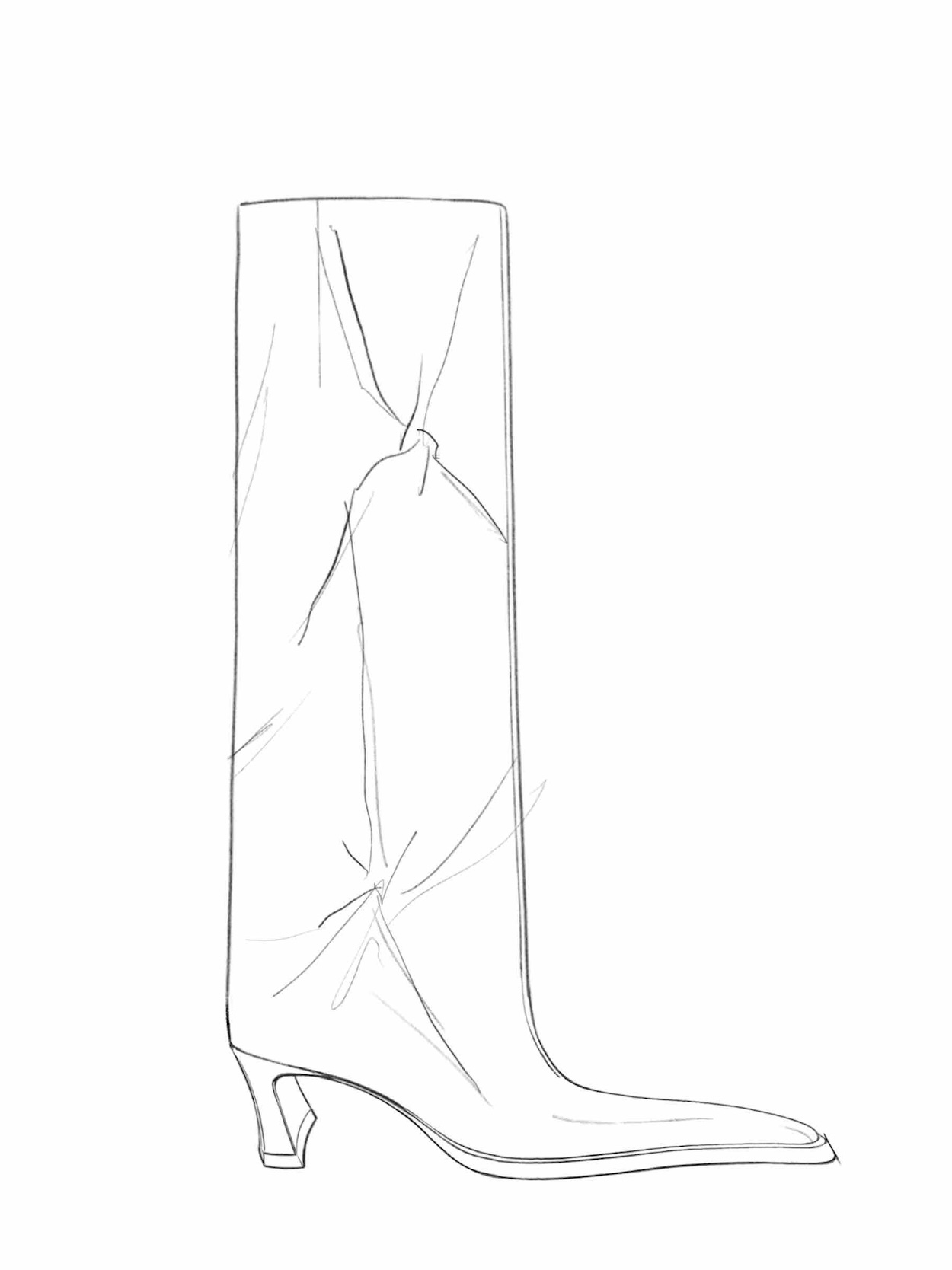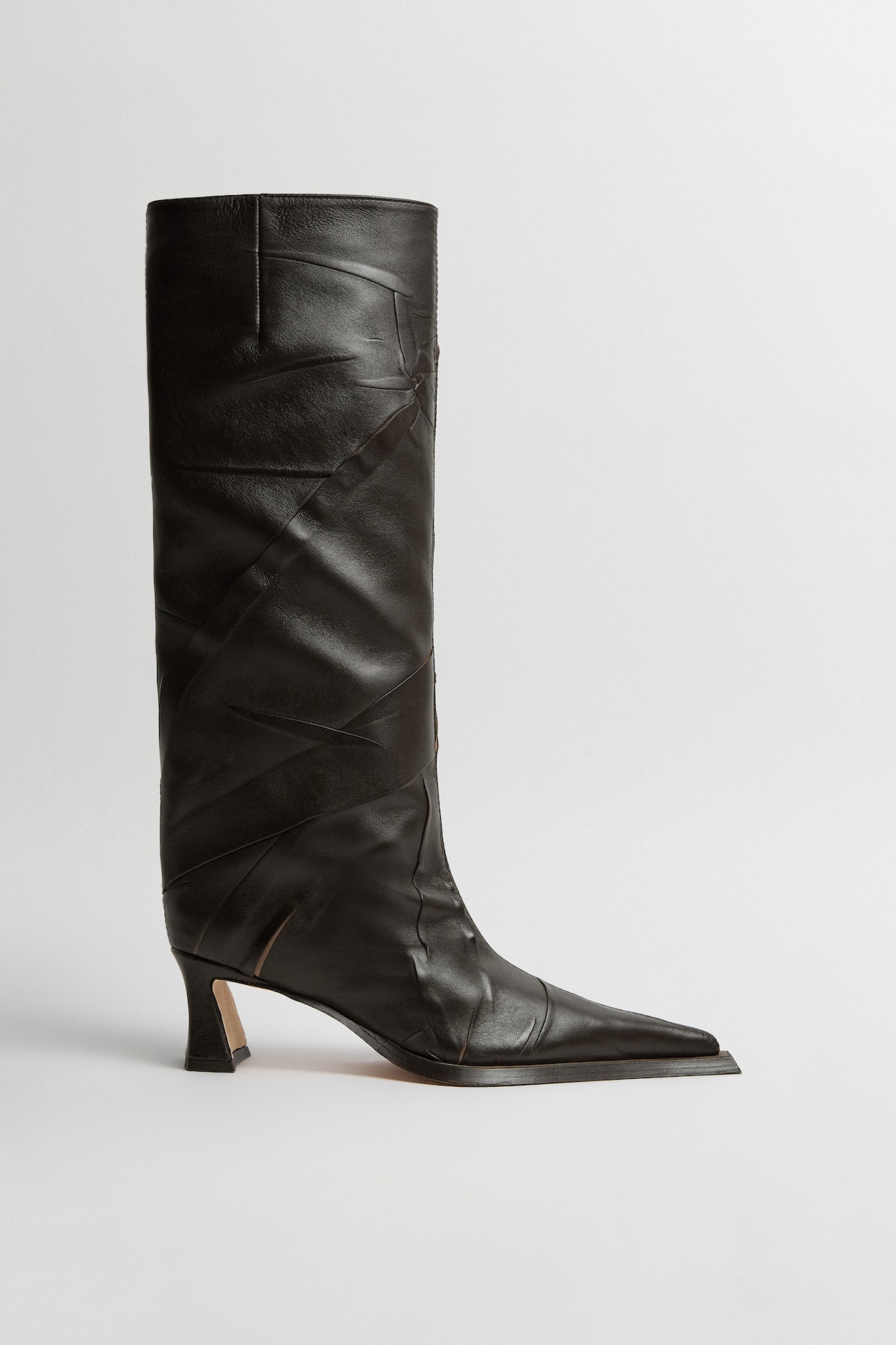 - A tall, fitted pull-on boot with a pointed toe, an outsized beak-shaped sole and a slim, sculpted 6 cm heel.