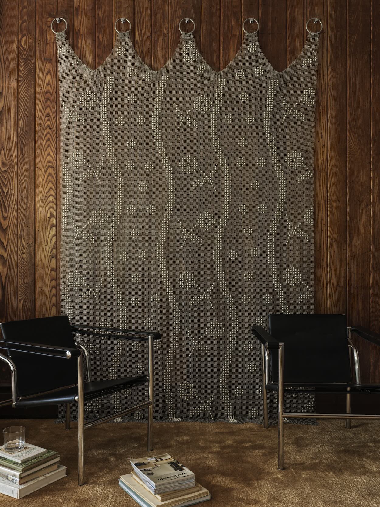 The pieces merge two opposing visual languages: the toughness of warfare materials and the delicacy of ornamental pattern. This hard/soft dichotomy has really become part of our design DNA. It’s charming and confrontational at the same time. And, the material allows us to get super specific when collaborating with our clients because we can make truly unique pieces, whether it’s a site specific architectural solution like a beaded chainmail screen, or a tapestry with a custom bead pattern tailored to the client in a deeply personal or culturally specific way.