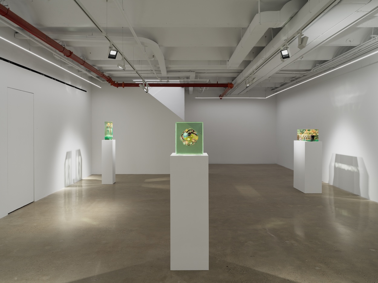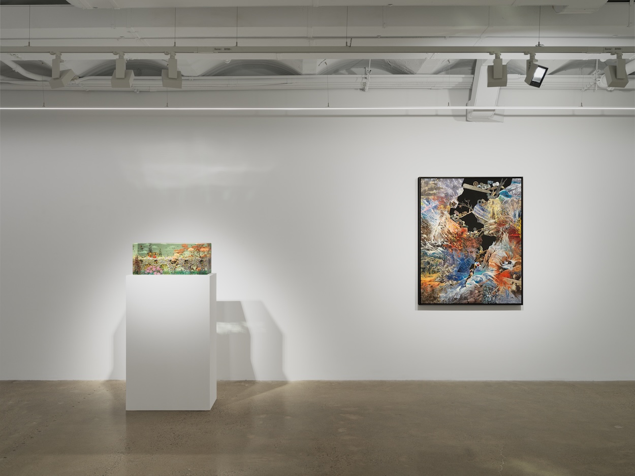 In Tribeca, “If a bird's nest is nature, what is a house?” sets epoxy resin and glass pieces in dialogue with painted collages.
