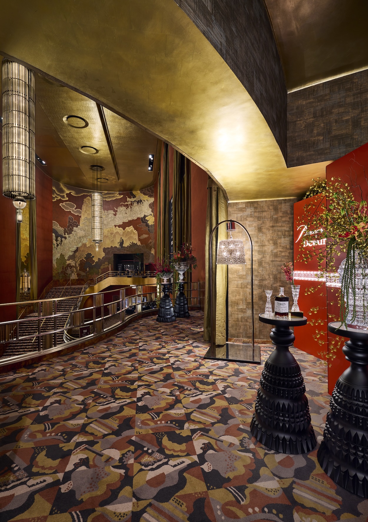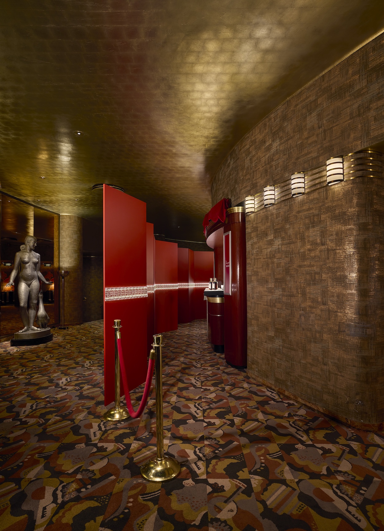 Accessible behind a red velvet rope, and perched above and open to the historic theater’s expansive lobby, the speakeasy marries the French maison’s luscious rouge colorway with exclamation points of gold. From the entryway through the backbar, Baccarat pieces punctuate the Art Deco design language and drinks will be served with rare expressions from Dewar’s Double Double range.