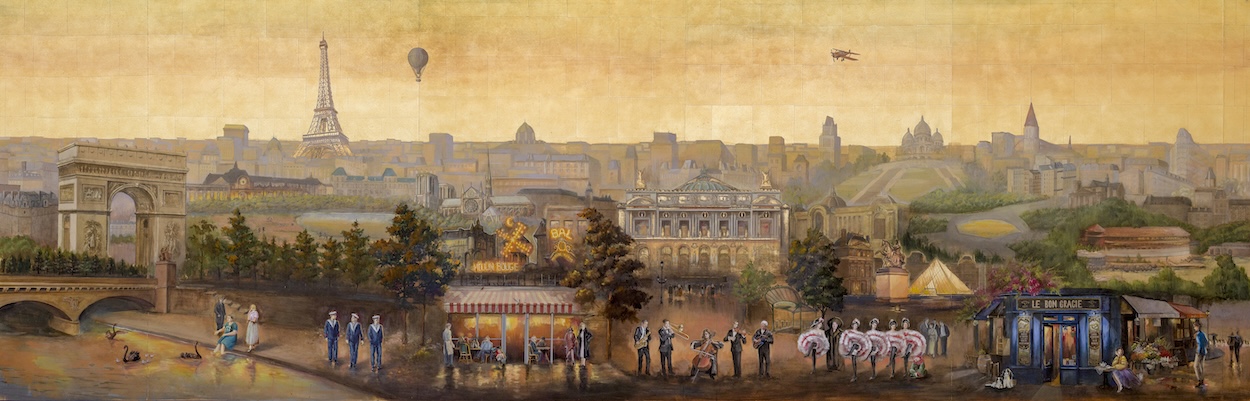 Within the landmark Tribeca building that houses the members’ club Maxwell Social, a series of hand-painted wallpaper murals portray historic highlights from the life of author and “professional hostess” Elsa Maxwell, whose legendary style of high-society entertaining inspired the community-oriented venue. Helmed by Gracie Wallpaper and crafted within their New York City studio, each mural required 60 to 120 hours of hands-on painting time—with casein paints applied to a gold leaf background further embellished with metallic accents.