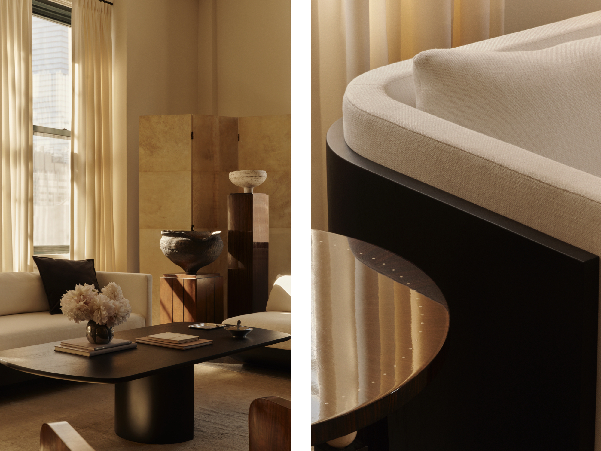 Calma foregrounds clean lines, organic shapes, and natural materials. This is evidenced by the gently curving daybed, which gives the visual illusion of flotation, and sets tailored linen upholstery upon an ebonized walnut, smoky walnut, bleached white oak, or honey white oak base. The same could be said of the stately dining table, where one detail—a vertical seam lined with antique brass—acts as an elegant exclamation point. It’s the sleek sofa, with its rounded timber screens enveloping the piece, that distills the vision behind the name Calma and the stillness it evokes.