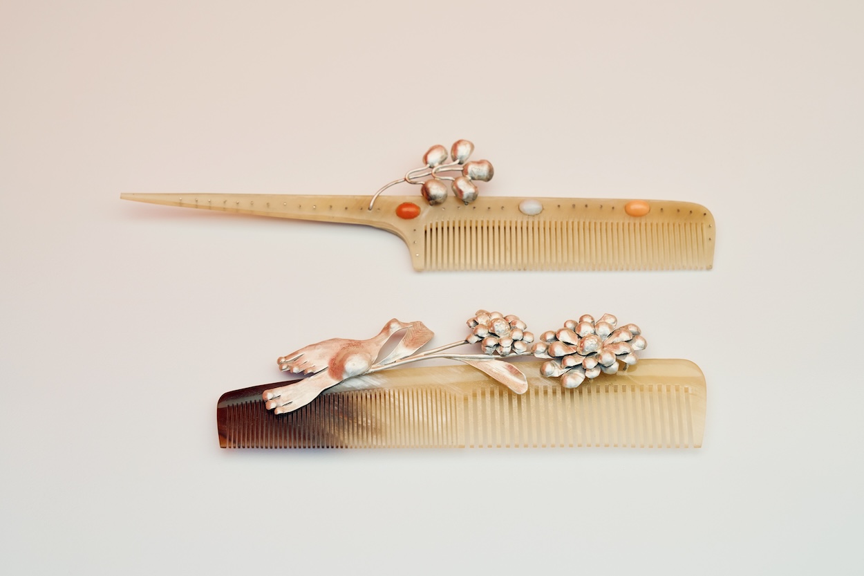 Like all of our exhibitions, the curatorial concept is explored through the inclusion of both historical and contemporary works. Staging all of these pieces (a German clothing rack from 1989, a carved chair from 1889 and Zoé Mohm’s gorgeously adorned combs made this year) together allows for engaging conversation around the diverse, artistic expressions of domestic, functional objects throughout different time periods. By placing these objects in context with one another, we may be able to learn more about our enduring creative impulses and the many ways we engage with our surroundings.
