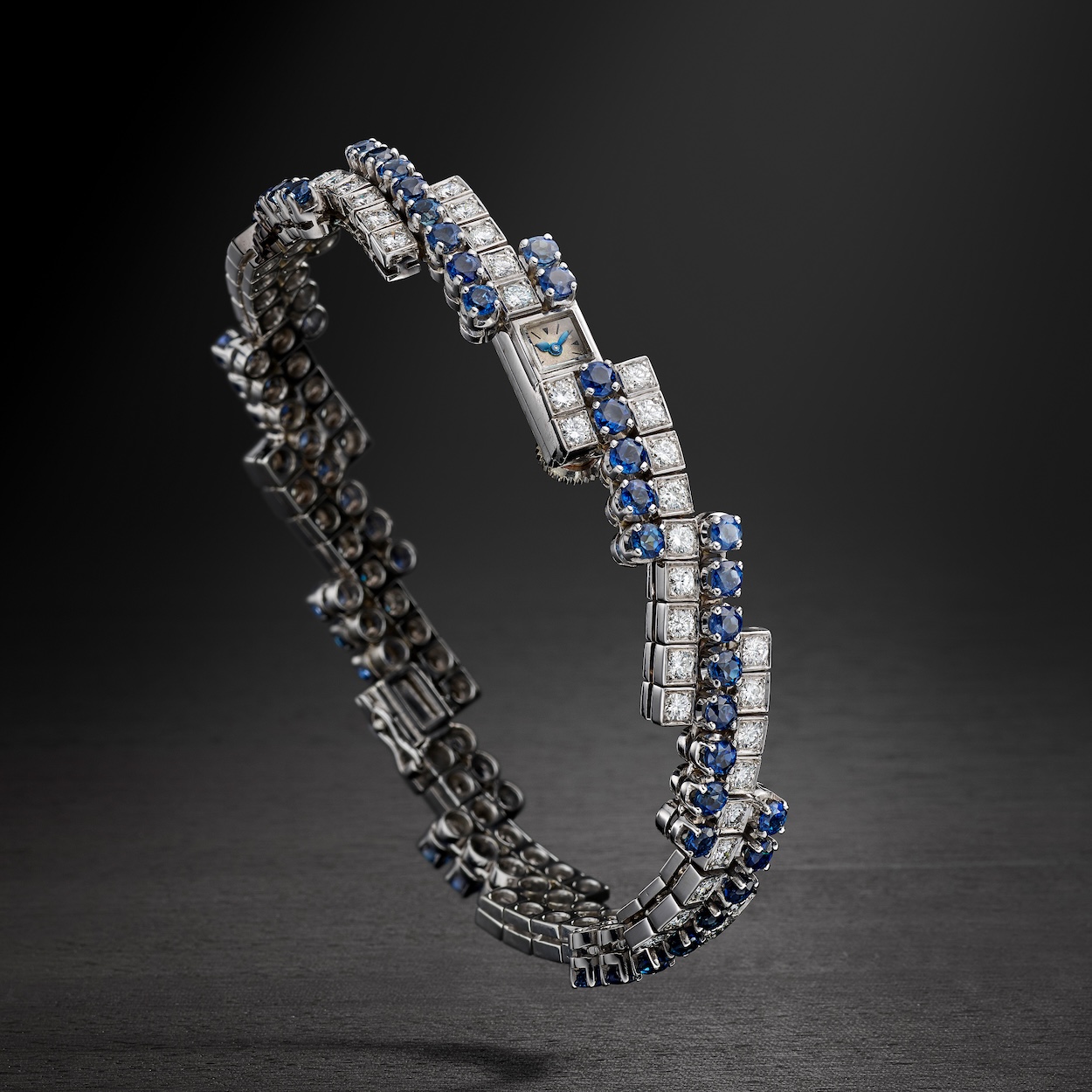 The capsule includes a rare 1950 Duoplan Tubogas watch, with a bangle defined by horizontal and vertical ribbing. In contrast, the 1941 Duoplan ‘Chaine’ features a broad, articulated bracelet, echoing the sleek utility of that era’s industrial design. In a more couture expression of Jaeger-LeCoultre’s watchmaking prowess, the striking Calibre 101 ‘Riviere’ high jewelry watch from 1960 is set into an undulating white gold cuff of diamonds and sapphires, housing the maison’s smallest mechanical movement ever made—one that is still in production today.