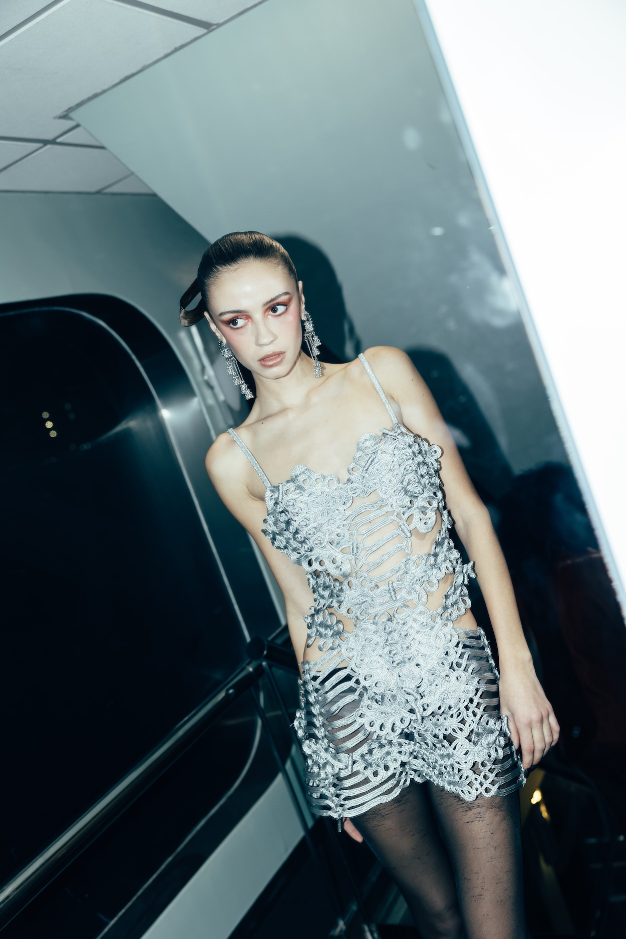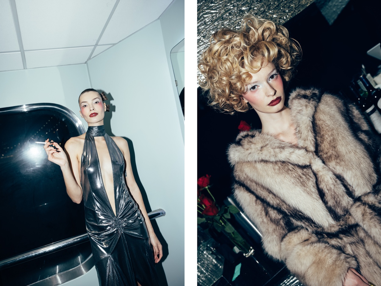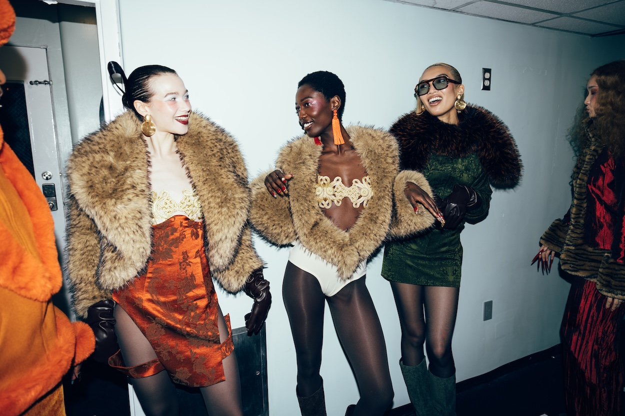 And then, there was the attitude. It’s one thing to see the collection’s ankle-length belted fur coat, iridescent plunge-neck gown, and V-waist leather pant-and-corset ensemble hanging on studio racks for retailers to peruse post-fashion week. It’s another thing to be mesmerized by the vampy show closer sauntering down the runway in a three-piece fringe and tassel lingerie set with an oxblood lip and a cigarette holder in hand as The Fifth Element’s “Diva Dance” bumps in the background. “She carried,” Shui says of the model tasked with bearing the runway show’s finale look.