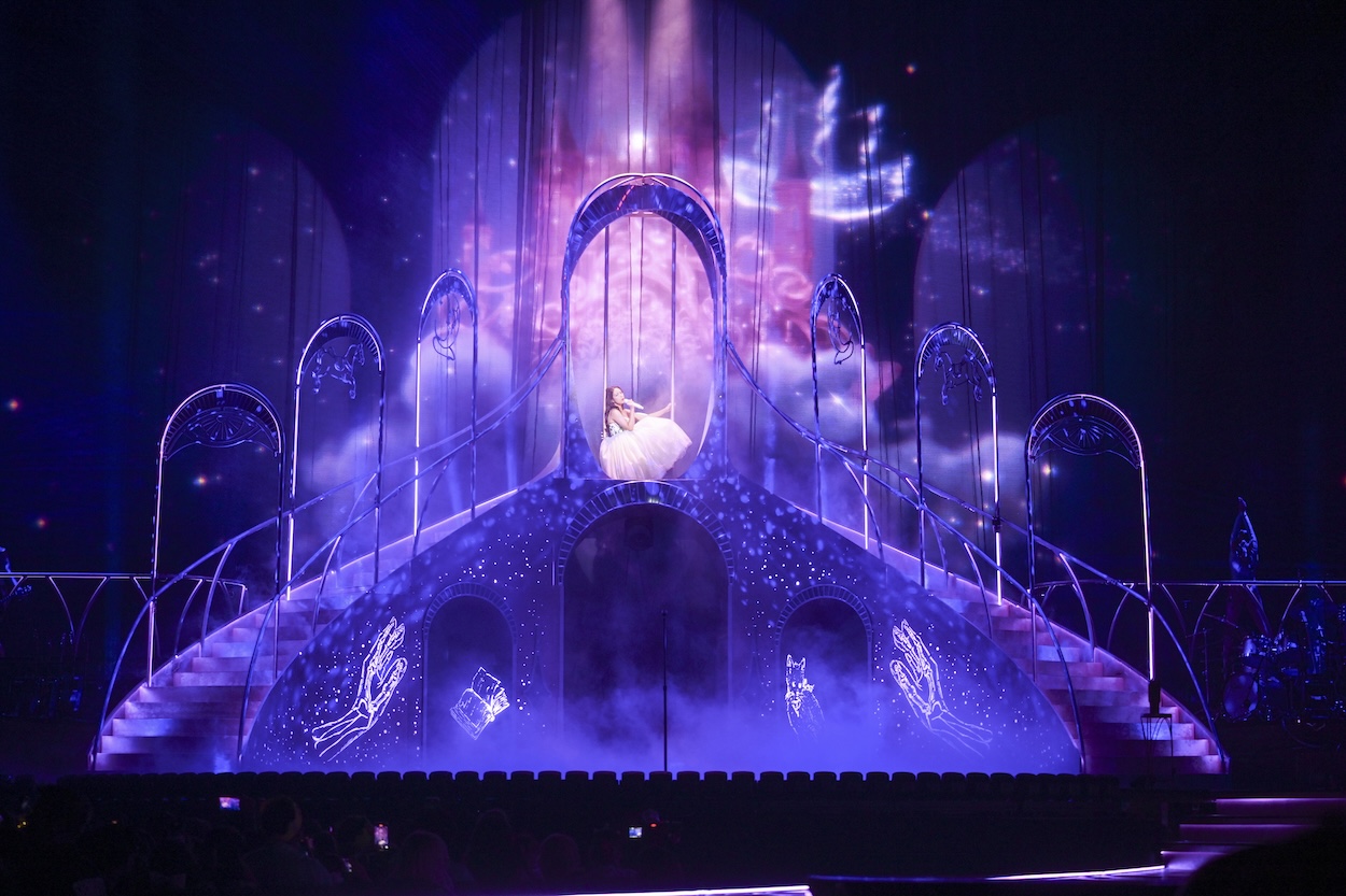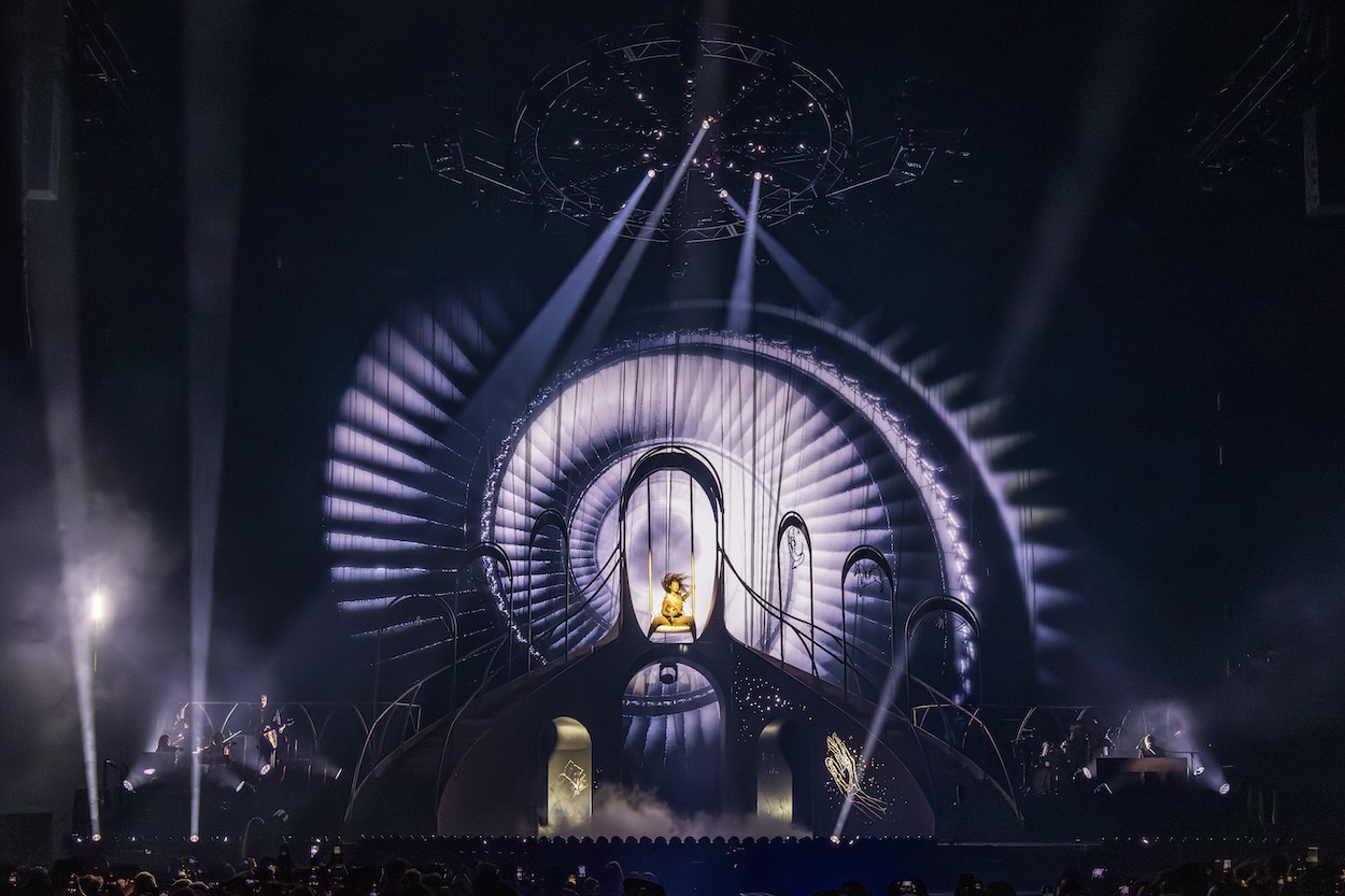 “Laufey staggered the world of jazz and pop, and like most artists, came with a series of reference images to outline the arc of the performance,” he says. Among those that Laufey and Junia presented to Lipson and Stufish senior designer Zarya Vrabcheva were, “everything from Busby Berkeley movies, to Old Hollywood opera sets, fashion shows, jewelry…a world of beautiful whimsy,” he recalls. But “an overarching theme of time” was among the performer’s biggest inspirations for her 43-show arena tour.