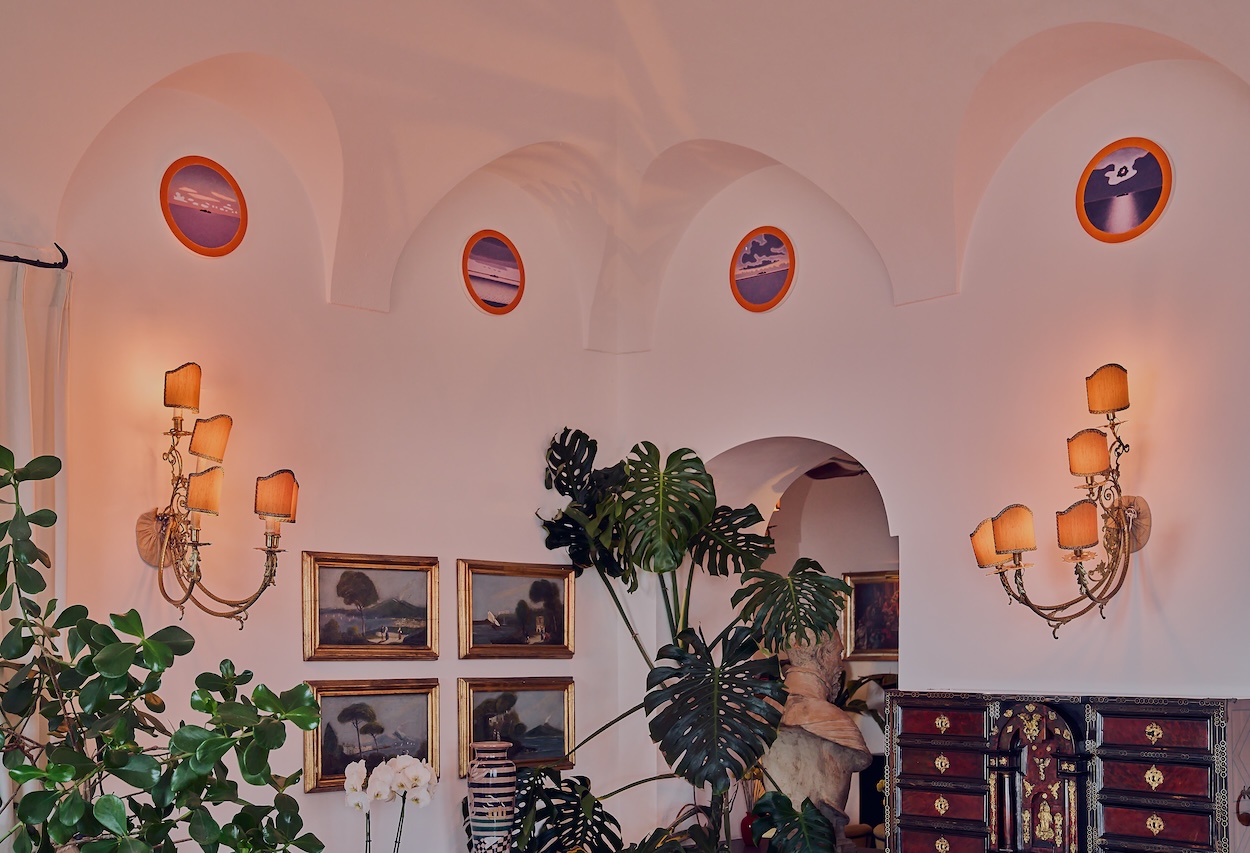 Through Bachmann’s circular oil paintings, Don’t Worry Music Bar is offered 20 portals into a liminal space, both real and imagined. It took the artist nine months to complete the commission. She explained that her work creating the series was “like painting a self-portrait, not only because the artist’s profession is a kind of island, but also because an identification takes place in the act of painting an island that allows you to bring it inside yourself and see it as a subject that is completely internal.” In many ways, this is a metaphor for Le Sirenuse which feels like an intimate, extravagant home with an impressive art collection.