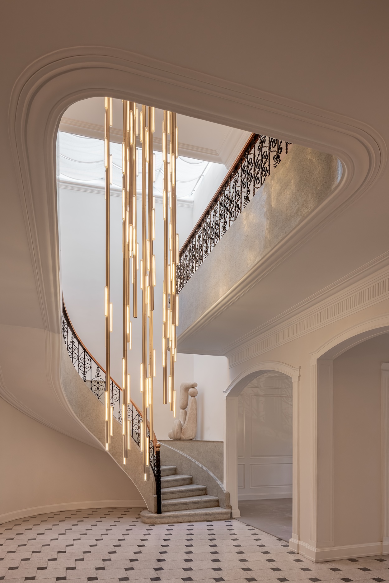 More than 50 sculptural works by designer Lee Broom now reside in the historic house that acts as Mexico City-based lighting specialist Diez Company’s showroom. This installation, titled “The Resident,” imbues the spectacular space with the materials, textures, and meditative radiance that have become Broom’s signatures. As with the designer’s other experiential exhibitions, the Diez residency is not only seen but felt; from room to room, it unlocks a sense of discovery. Glowing highlights are plentiful—from the cascade of Broom’s Hail Chandelier in the central atrium to the matte gold bathroom, where Chant chandeliers and portable lamps form a grid.