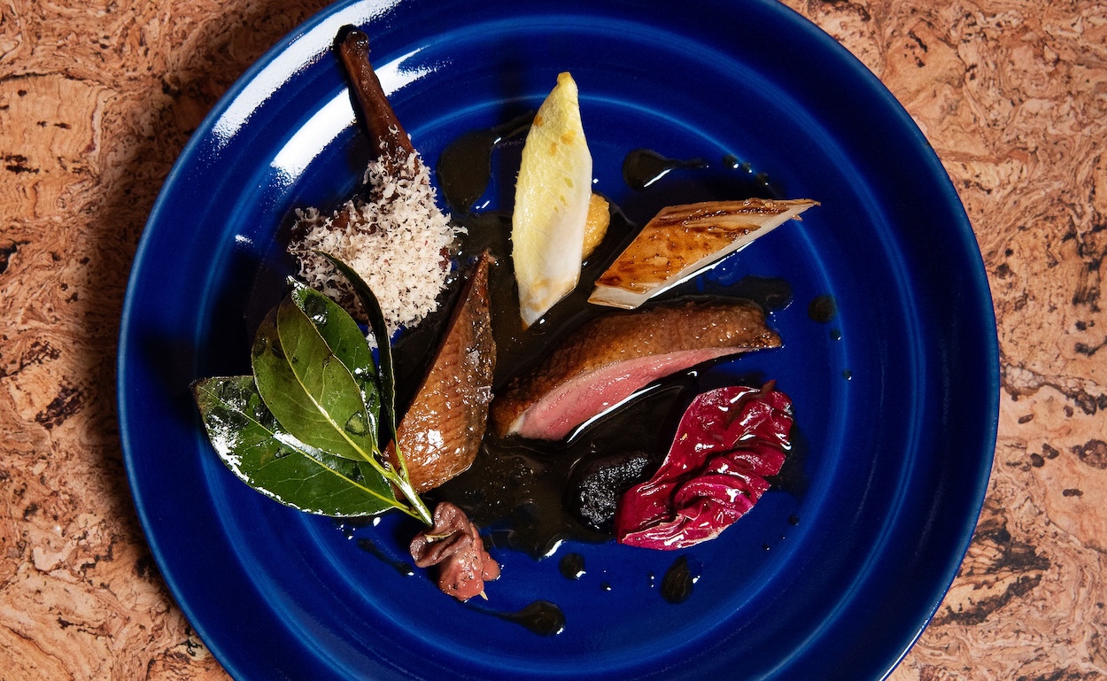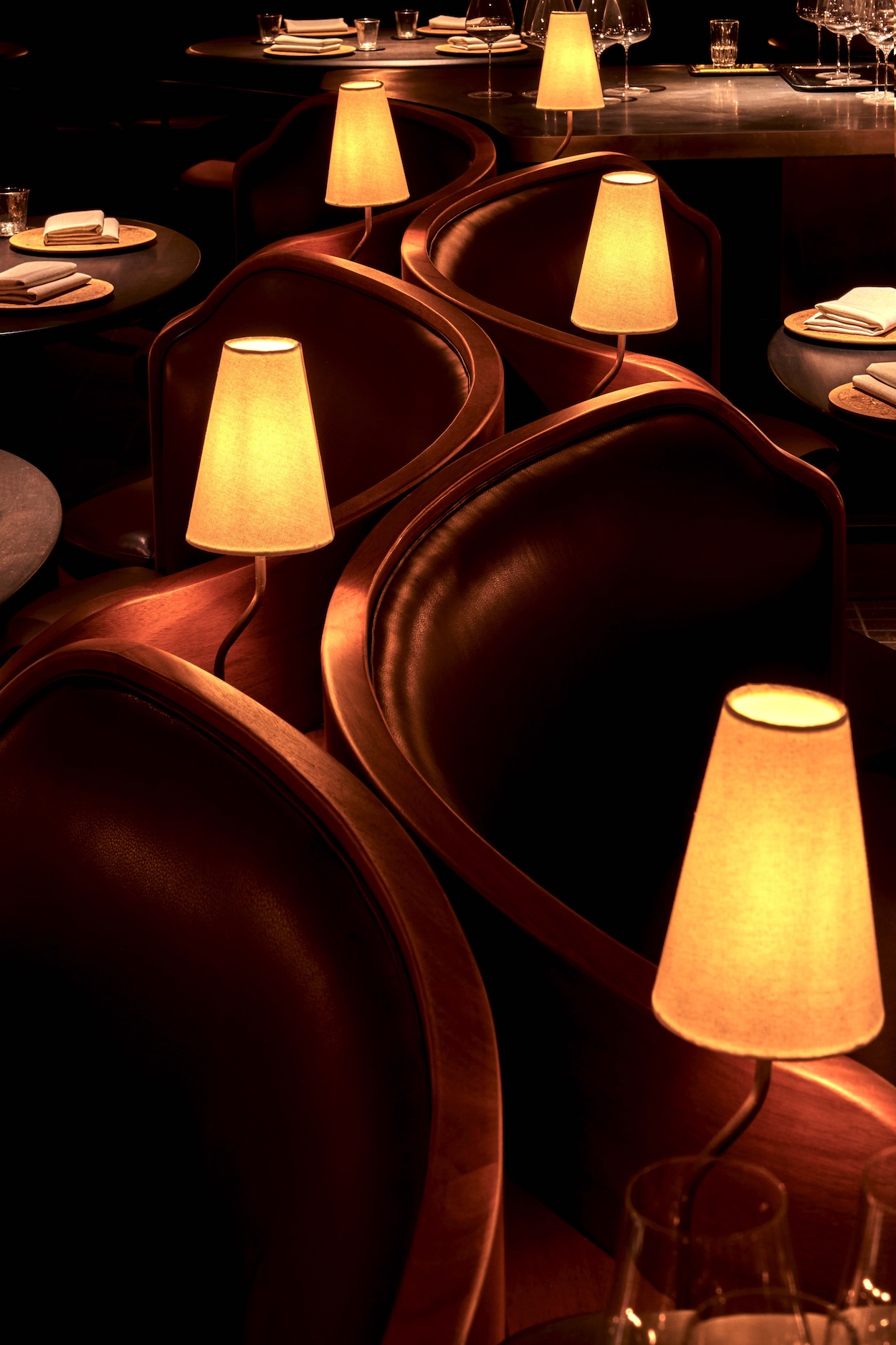 Jernmark asks guests to get comfortable. Seated side-by-side on merlot-hued leather-upholstered loveseats that snake through the 2,300-square-foot subterranean space, Lielle’s 42 diners are quite literally in close quarters. Thanks to the chef’s kindred collaboration with L.A.-based design firm Lovers Unite, they’d never know it. These custom banquettes are curved inward, keeping the focus on the California-inspired tasting menu he serves atop ovoid cherry wood tables set with a tablescape by his wife and creative partner, Andrea. It includes cork chargers, hand-sewn linen napkins, and wabi-sabi ceramic elements of service.