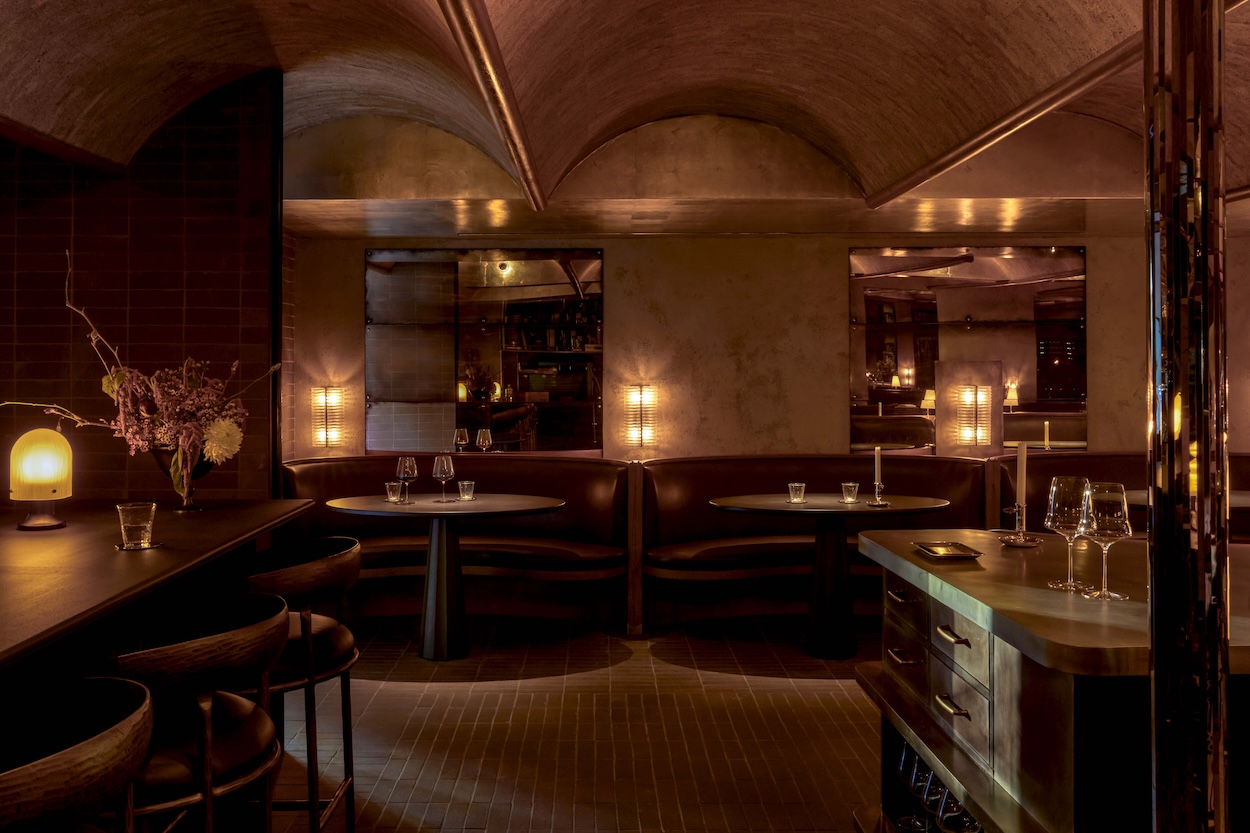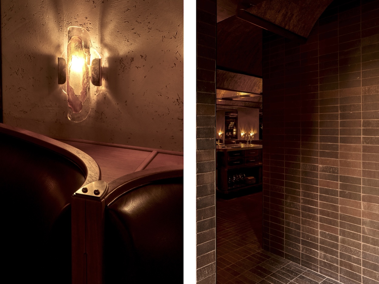 A few steps below ground, the windowless, low-ceilinged dining room had its challenges, but Lovers Unite cofounders Alan Koch and Karen Spector leaned in. Envisioning the space as a historic wine cave, they plastered the walls; added brick pavers by ORCA to the floor, entry, and bar; installed a cork-lined, barrel-vaulted ceiling overhead, and employed antique mirrors and silvered lunettes to pool soft light from a selection of vintage Danish and French sconces, mirror-tipped bulbs, and custom table lamps made by local designer Matt Alford toward the presented food. In the bathroom, striated red travertine and stainless steel accents parallel the disco ball–like columns in the dining room. Using raw materials allows the visible presence of the makers’ hand in the design, as it is in every dish. Cozy and moody, “we turned the restaurant into a hug for the tasting menu,” says Spector. After all, adds Koch, “chef Jernmark’s not really just about food; he’s about total experience.”