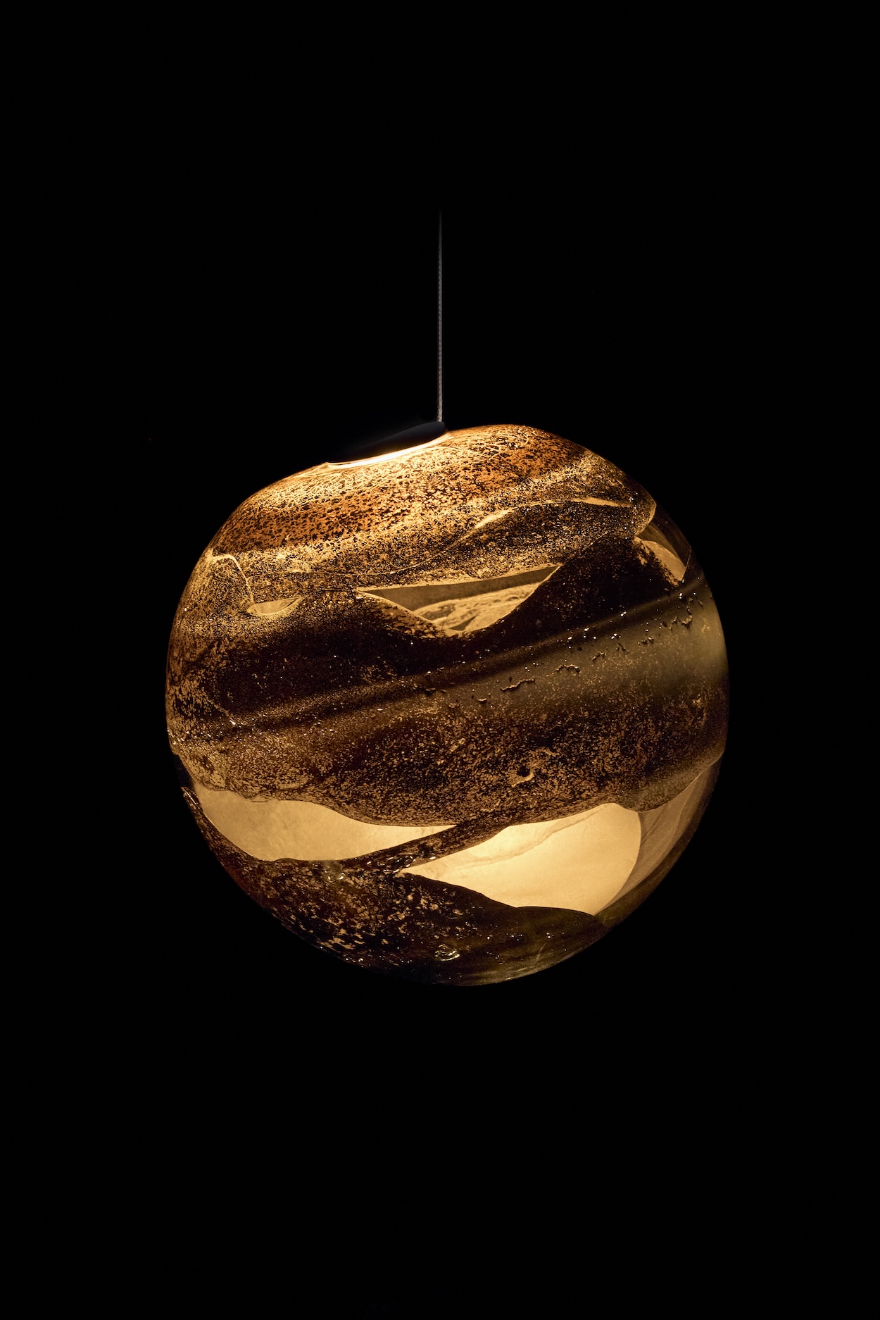 What results are striated and textured pieces, each uniquely formed by the glassblower’s movements, as well as the two materials’ behaviors where they meet inside the orb or vessel. When lit from within, some of the lights appear like gaseous Jovian planets, others like ancient pressure-made rock formations. As with those natural creations, Bocci’s aluminum-and-glass works required careful composition to achieve their spontaneous outcomes.