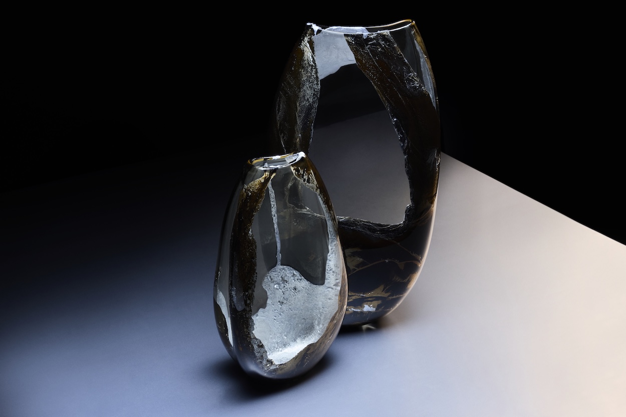 The material behavior of liquid aluminum creates striated glass orbs and vessels