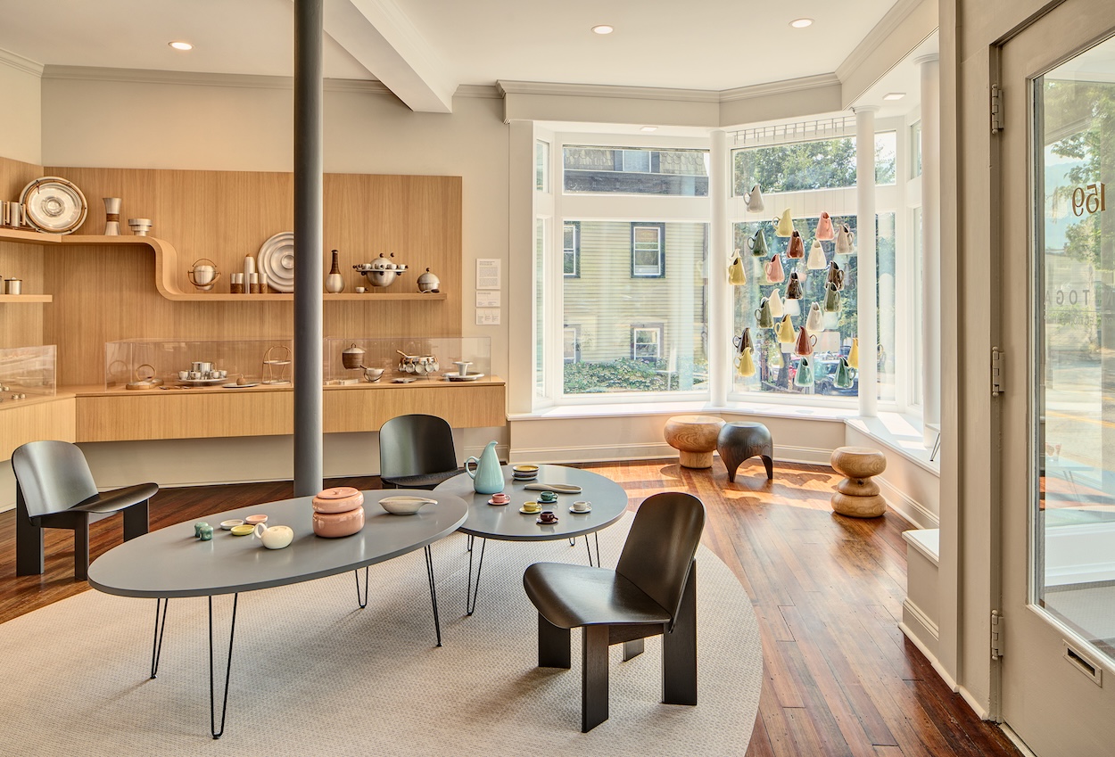 Though the on-site design gallery is an exquisite addition to Dragon Rock, its footprint is small in comparison to Wright’s legacy. From this discrepancy, the Cold Spring storefront was born as an interim step—and also designed by Studio Joseph. “It’s called Manitoga Design Collection + Shop,” Cross explains, “because one part is a display of the permanent collection. We opened it with spun aluminum so that visually it ties back to Manitoga, the place, with the same blond wood and curved shelving. But then we launched by selling vintage American Modern pieces, which we’ve not done before.”