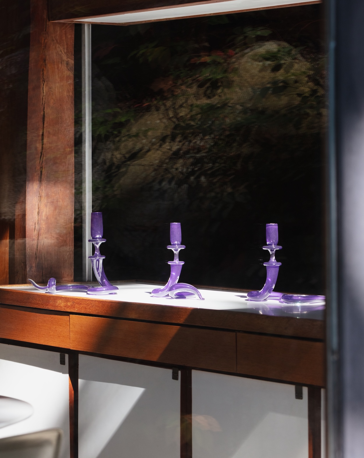 The consignment happened organically. “We decided that we would offer objects on consignment by artists and designers who have been part of our installations at Manitoga,” Cross says. “It began with Kieran Kinsella and Rodger Stevens. Kieran made tables from a fallen tree at Manitoga. This year we have Jeff Zimmerman; he has these Serpentine candle holders and had just issued this beautiful green color, which ties it back to Manitoga. We have the purple ones on site at Dragon Rock, but we have white and green offered at the shop.”