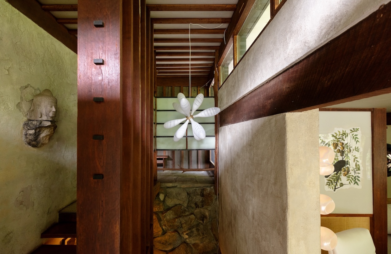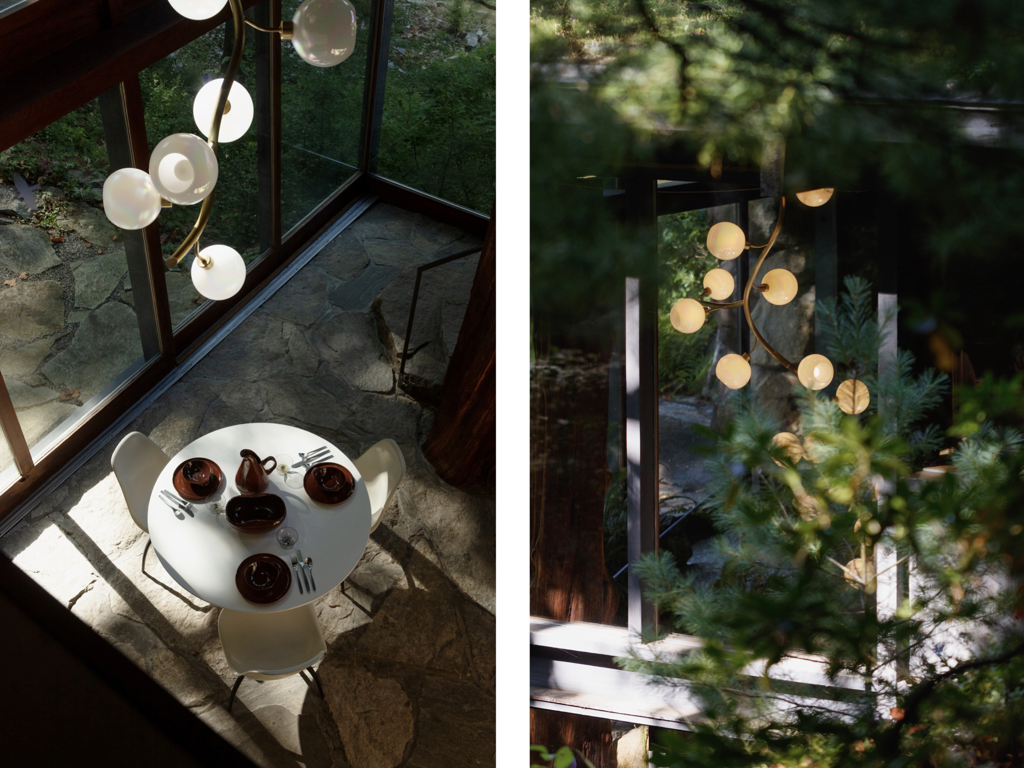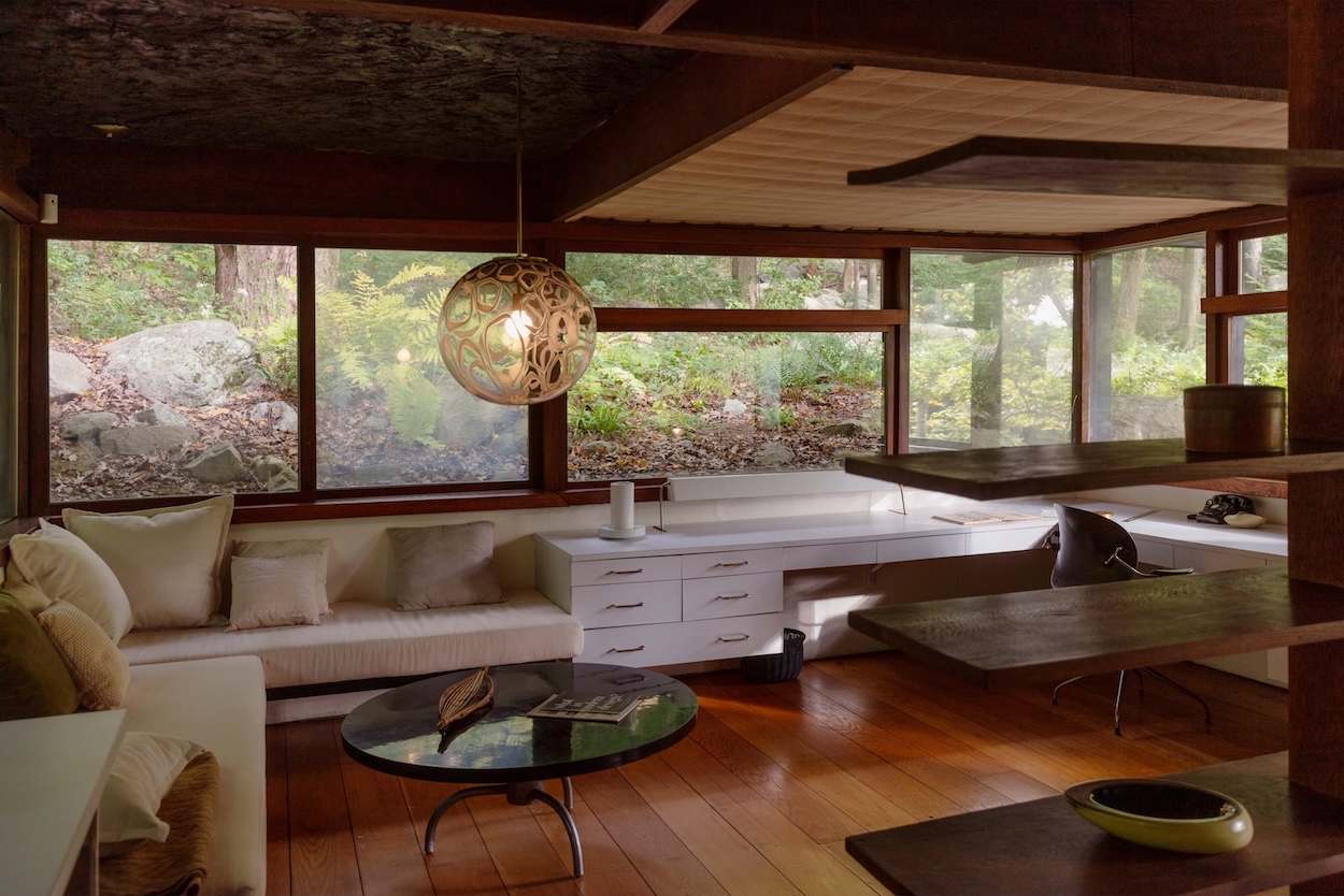 “Jeff Zimmerman’s work in glass has always been experimental,” Cross says of why he was an ideal fit. “He’s pushing materiality and how one works with glass. And part of the dialogue with Russel Wright and of Manitoga is that Dragon Rock is an experimental home. He and Mary, at the time, were leading innovators in form, in color glazes, in mix and match.” In addition, Cross appreciated the idea of incorporating light fixtures that could illuminate the interiors and highlight the materials and the volume.