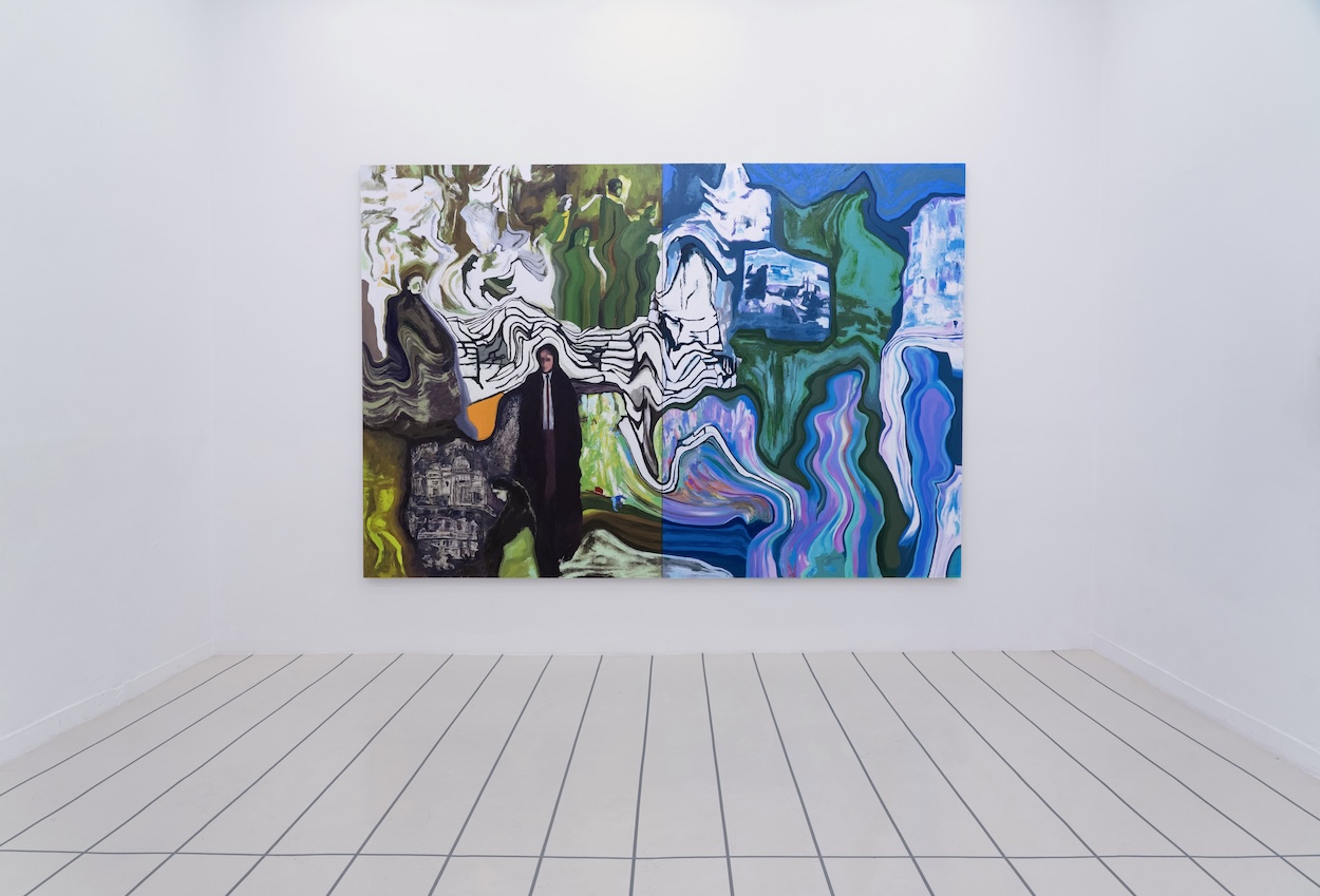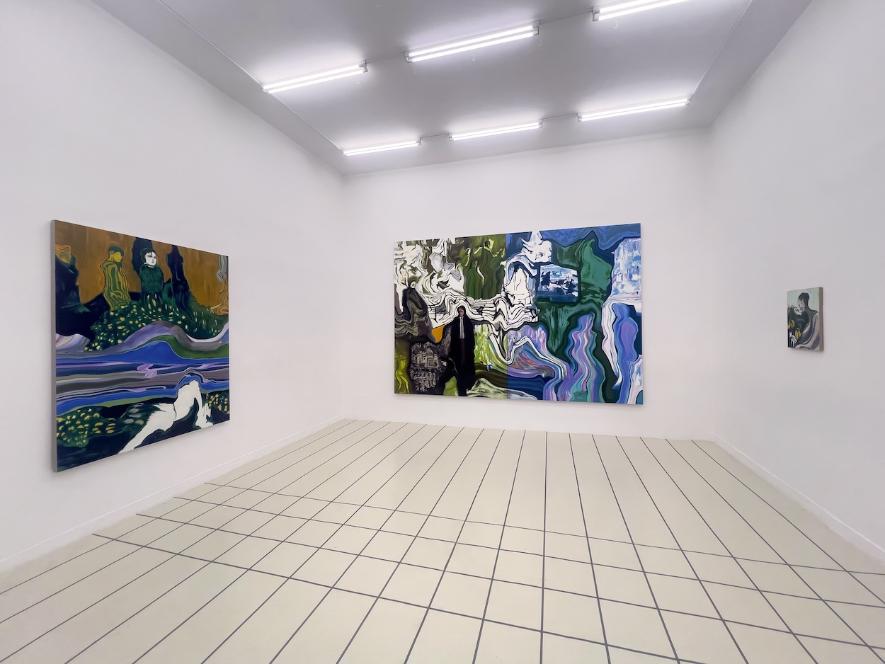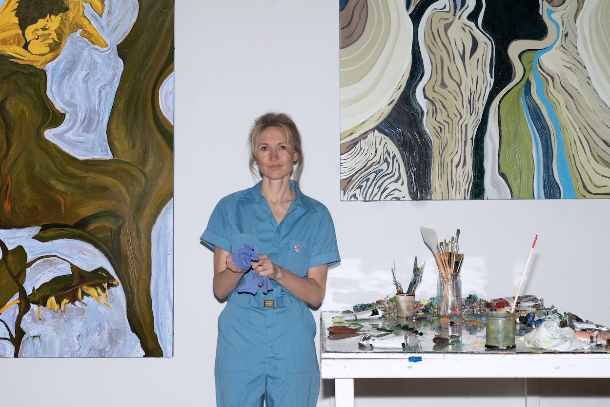 An interesting feature that’s not immediately noticeable: All of these paintings began on my tablet. I used to start on a blank canvas and see where it led but would repaint it endlessly. I love that the technology thinks as fast as we do. I can try a hundred different color combinations in seconds. I can erase. I am always cutting and pasting from other drawings. I work in endless layers so these paintings become infinite realities. And there are all of these beautiful happy accidents. It’s a collaboration with the ether and the machine. Then you get another layer of magic in the paint and the revelations that happen there.