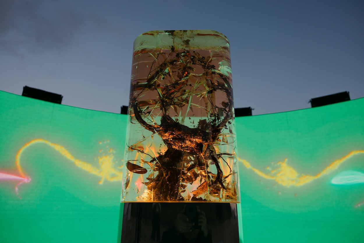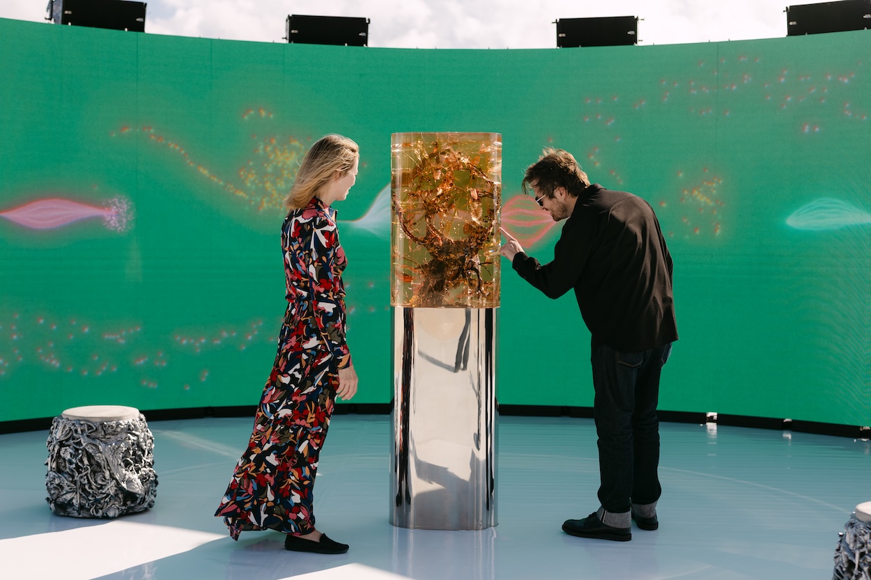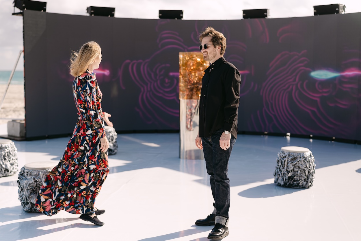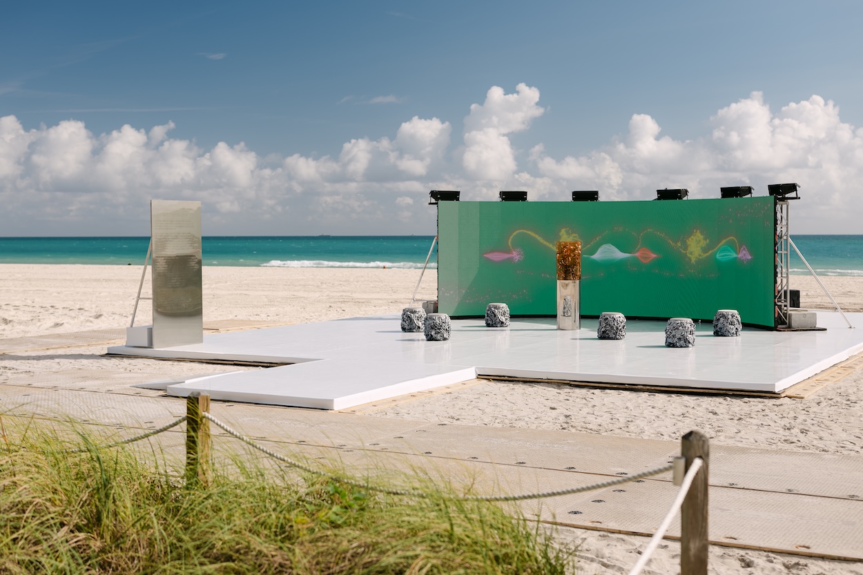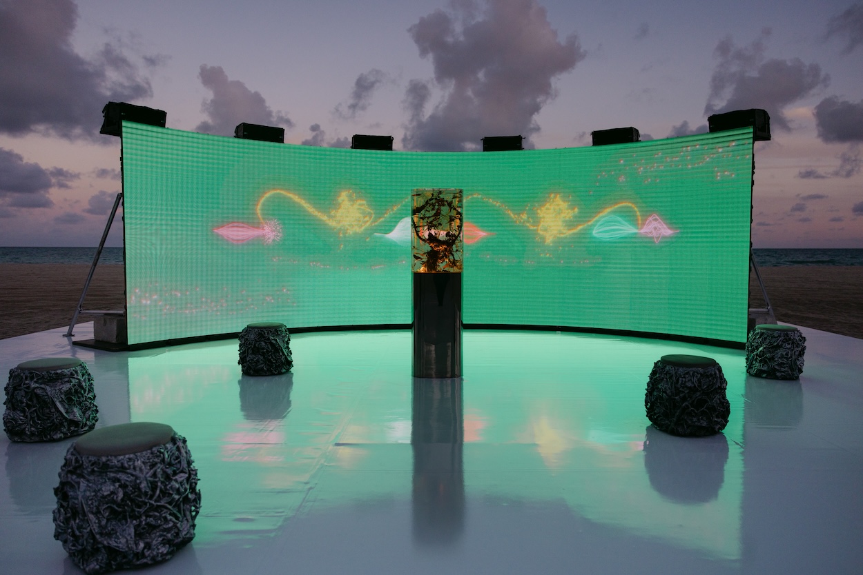 This Miami Art Week, one of the most compelling destinations was the beach itself due largely to the programming of Faena Art. It was here that the culturally curious (as well as those just seeking sun) found Warsaw-based multidisciplinary designer and artist Marcin Rusak’s Plant Pulses, an herbarium time capsule set in front of a large-scale curved screen presenting an animation paired to a manipulation of the tick emitted by vines. For those who didn’t dive deeper into the work, a collaboration with Maison Perrier-Jouët, it was another spectacular visual set into the sand close to Es Devlin’s The Library of Us.