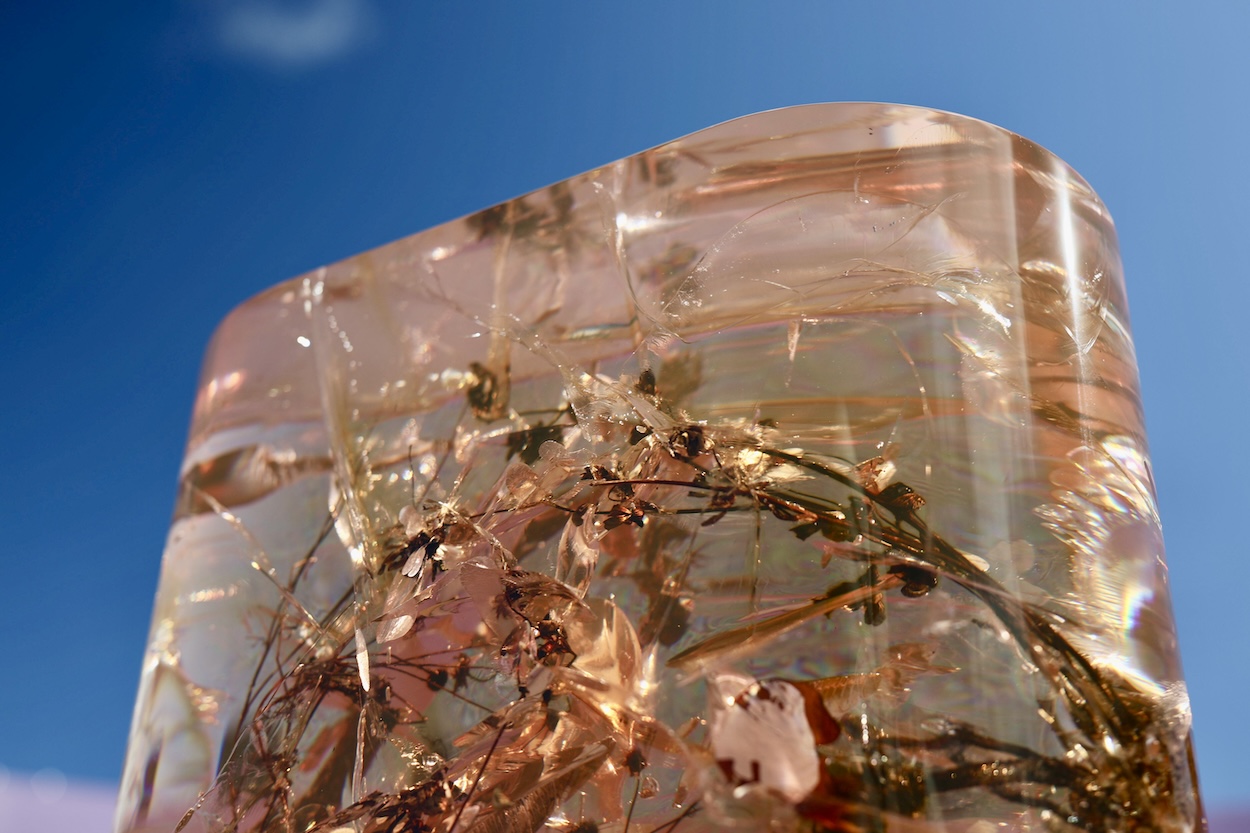 Within his resin herbarium, Rusak has frozen “hero plants” from Perrier-Jouët’s vineyards in Champagne, France. After meeting with biodiversity experts from the maison’s scientific committee, he ascertained that three plants—known as axiophytes—play a key role in indicating and preserving the health of the terroir. Rusak harvested them—the vine, European birthwort, and white clover—then he froze them in time. This central piece of the installation is, in essence, a guide to decoding the soil of Perrier-Jouët right now.
