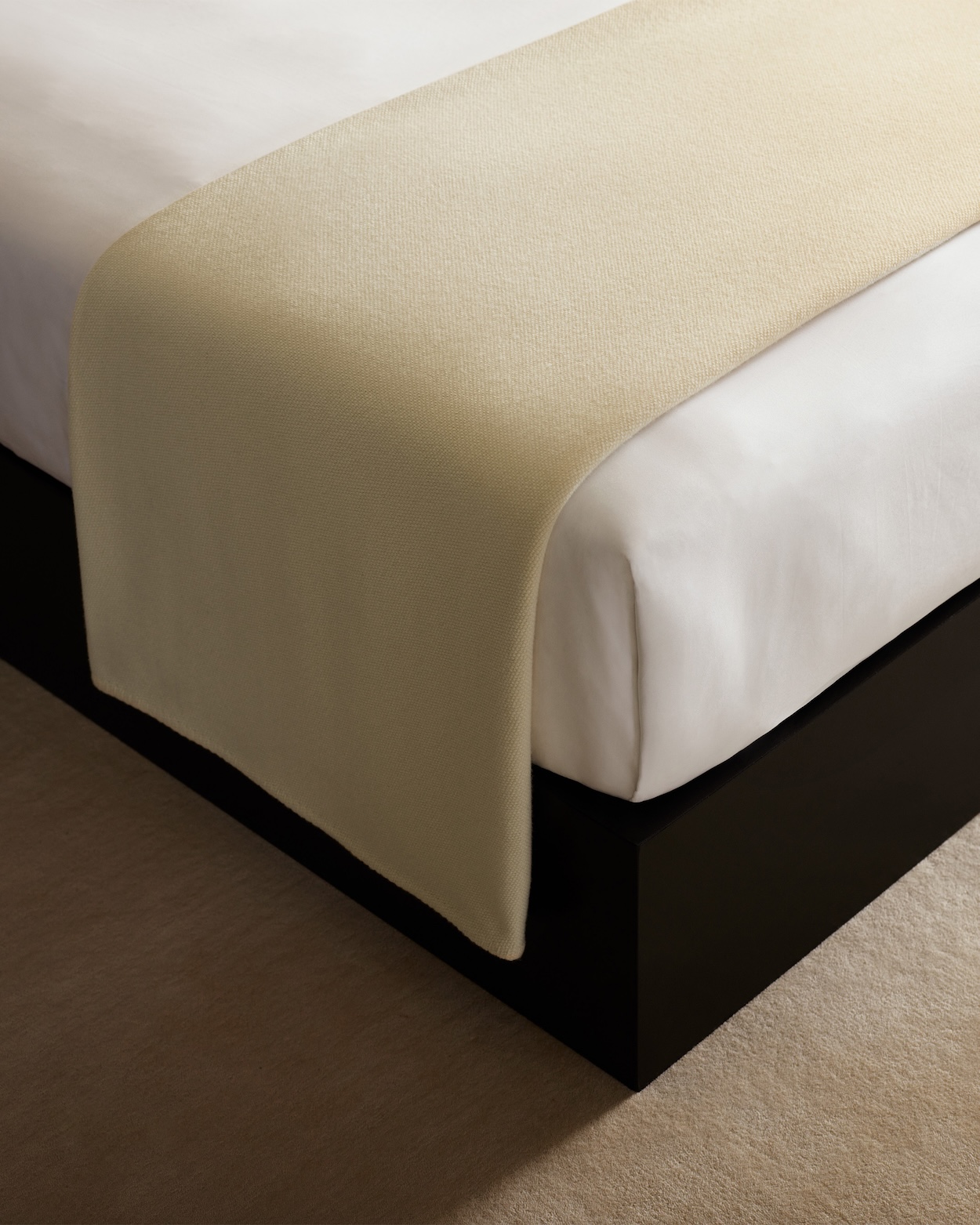 The concept of comfort with discipline underscores the bedding and the throw. “We wanted pieces that make the bed feel complete—soft layers that don’t look messy,” Laserow explains. “There’s a fine line between inviting and undone. Our throws and bedspreads are meant to bridge that: luxurious textures like cashmere, wool, and our specially developed Teddy Velvet which is extra high-pile—but always with a tailored edge.”