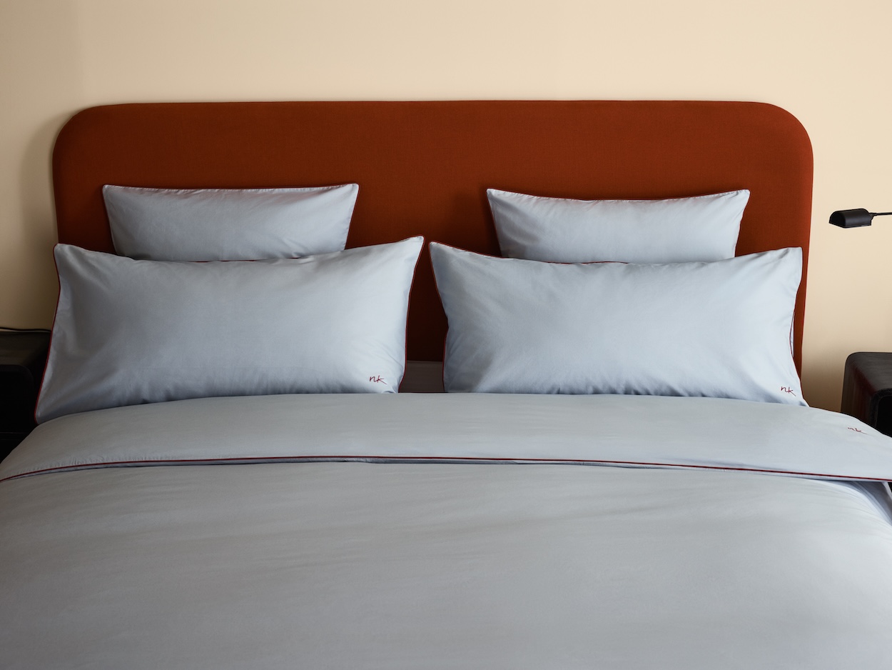 For everyone familiar with the meticulous specificity of Nordic Knots’s rugs, the shades for the home collection bedding (four in percale and three in sateen) are worth noting. “With the percale, we wanted that crisp, tailored hotel feeling—the one that’s cool against your skin. The colors are subtle yet distinctive: crisp white, crisp white with black piping, sand with white piping, and a shirt blue with burgundy piping,” says Laserow. “The sateen, on the other hand, is smoother, softer with a gentle sheen. The hues here are crisp white, shirt blue, and sand. All classics.” Both bedding categories are made from pure 400 thread count Egyptian cotton—and complement Nordic Knots rugs and interiors.