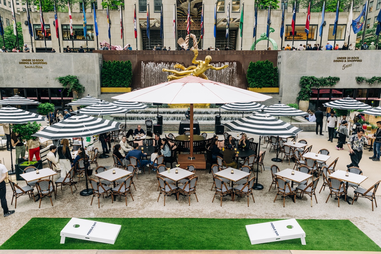 Open now through September, Pebble Bar at The Rink is an outdoor drinking and dining destination that sets the cocktail lounge’s award-winning program within the iconography of Rockefeller Center’s ice rink. Using black-and-white striped umbrellas, high-top tables, and outdoor furniture, Gachot Studios bridged the sophisticated aesthetic of Pebble Bar with that of a summery outdoor café—set below the venue’s golden Prometheus statue. The beverage program is helmed by Pebble Bar’s Authentic Hospitality, while the seasonal light bites are provided by rink-side neighbor, Jupiter, from Michelin-starred chefs, Clare de Boer, Annie Shi, and Jess Shadbolt. A surprise addition completes the al fresco experience, and is available for all to enjoy: bocce.
