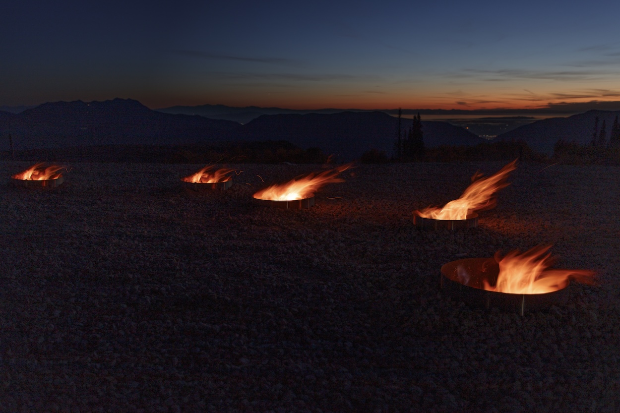 Powder Art Foundation intends to introduce a few pieces in advance of each ski season. Prior to the 2025-2026 opening, two historical works and two new commissions joined the previous year’s installation, which was a series of interactive bell sculptures by Davina Semo. Three works also preceded the establishment of Powder Art Foundation: a kaleidoscopic installation by Gerard & Kelly, a sound installation by Susan Philipsz, and a large-scale sculpture by Griffin Loop. From Ojo’s spectacular piece—a series of crystal chandeliers strung from the evergreen trees, named …and that they hadn’t heard us calling, still do not hear us, up here in the tree house…—to Sekine’s quietly moving Phase of Nothingness – Stone Stack, the curation already demonstrates that Powder Art Foundation intends to surprise and delight.