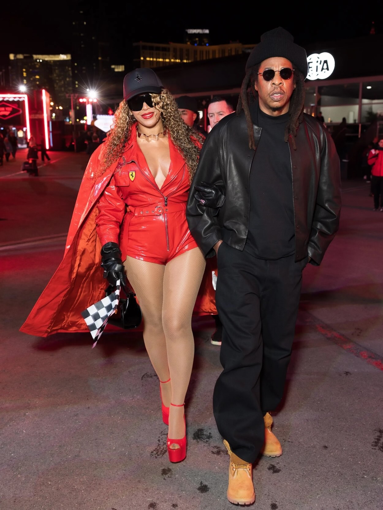 At F1, Beyoncé swapped her white leather driving suit for a fiery red Ferrari playsuit.