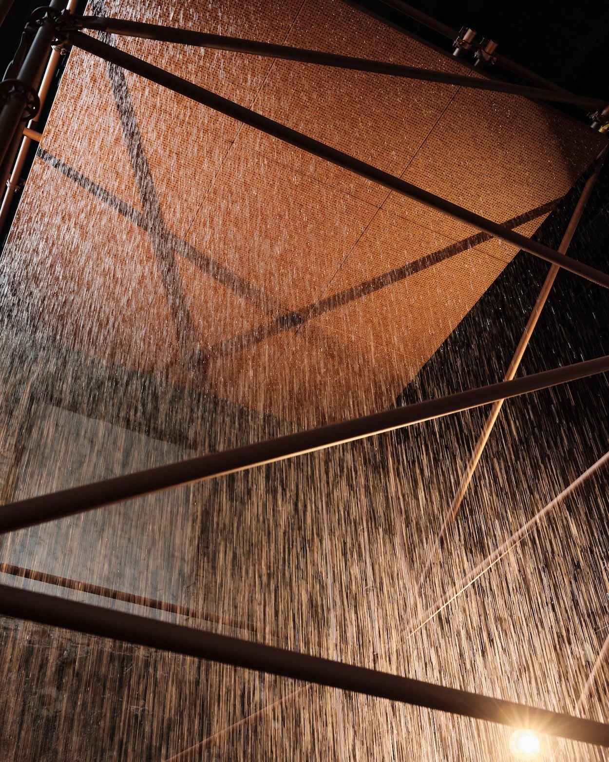 To reflect on the experience of rain is to uncover more than droplets descending from clouds. It is the cooling gusts of displaced air, the humidity born from vapor, the auditory patter upon contact, the scent of petrichor, and more. With Transposition, a site-specific sculpture by Dr. Samuel Ross MBE housed in an old bell foundry, all of these sensory facets have been replicated—the mist, the rush and churn of rain falling upon water, the rolling percussion. The architectural work is composed of three skeletonized copper towers, escalating in size and scale, each of which produces rain.