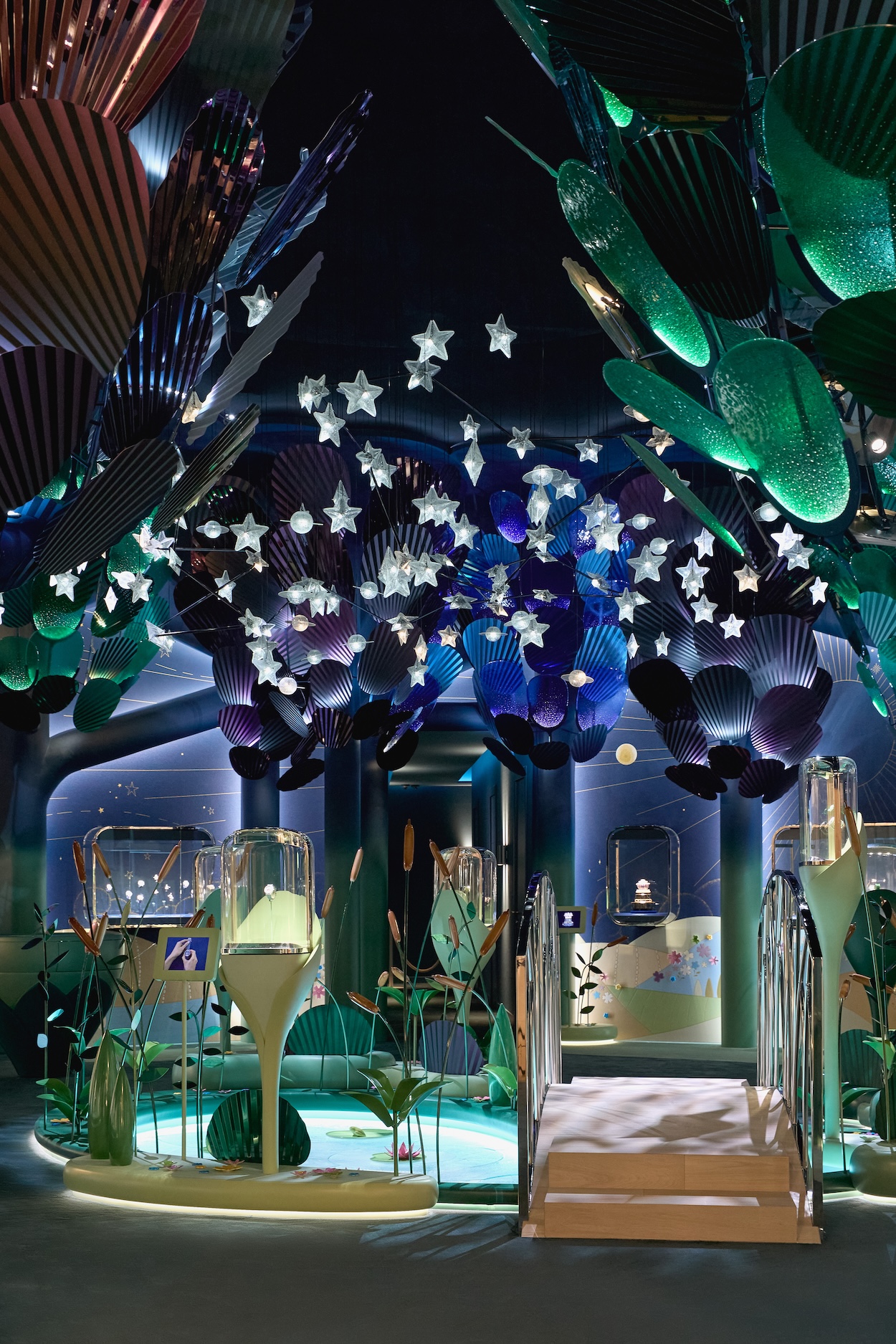 This year, Van Cleef & Arpels themed its installation “Poetry of the Heavens,” an apt title for a colorful corner embellished with a Murano glass constellation chandelier, above a glass pond, surrounded by metal guilloché trees with glass leaves. Ceramic enamel flowers also dot the interior landscape. The French fine jewelry and haute horloger even clad the walls in tapestry composed of gold thread.