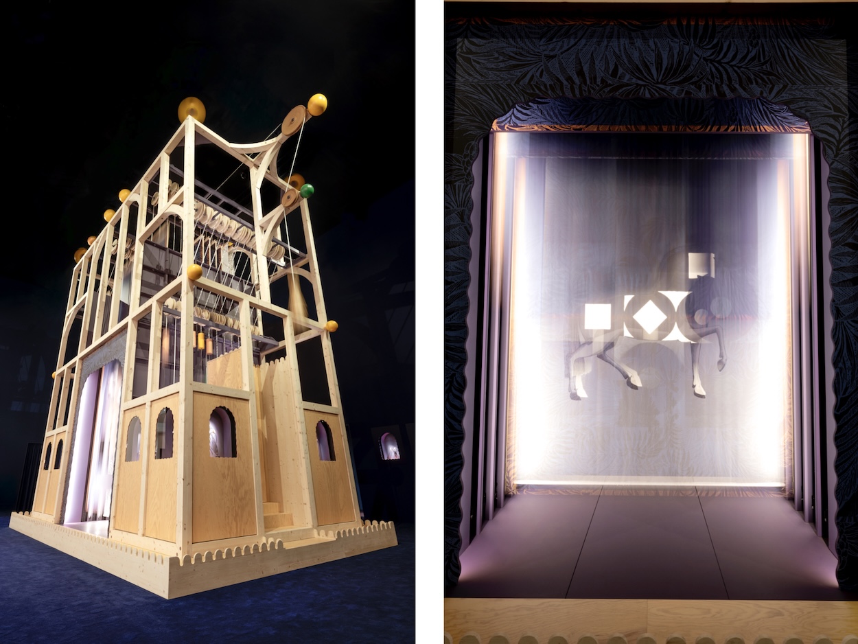 Nearby, Hermès installed a towering work by French artist Jean-Simon Roch, named “Mysterious Mechanics,” that acts as both the stage (for watches) and the theatrical production itself. In essence, a room-sized wooden automaton, the kinetic sculpture’s rope-and-pulley system stays in motion, readjusting a series of panels that reveal an ode to Gianpaolo Pagni’s horse motif. Of course, it also embeds vitrines with three new skeletonized timepieces: Hermès H08 Squelette, Arceau Samarcande, and Slim d’Hermès Squelette Lune.