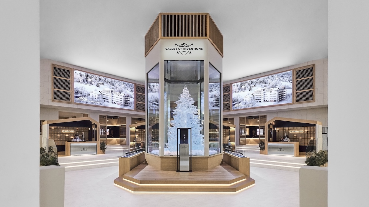 An Alpine utopia greets guests arriving at Jaeger-LeCoultre’s booth, this year themed “The Valley of Inventions” as an ode to the watch manufacture’s wintry home in the Vallée de Joux. The centerpiece: Michel Amann’s four-meter-tall pine tree installation, named “The Sentinel of Invention,” is composed of six tons of ice. Scent, sound, and gusts of wind enhance the experience. Directly behind it, Swiss chef Gilles Varone helmed a gastronomic experience—focused this year on cheese—within the installation’s restaurant, Le Chalet. Live watchmaking demonstrations and fifteen extraordinary new timepieces also punctuated the site.