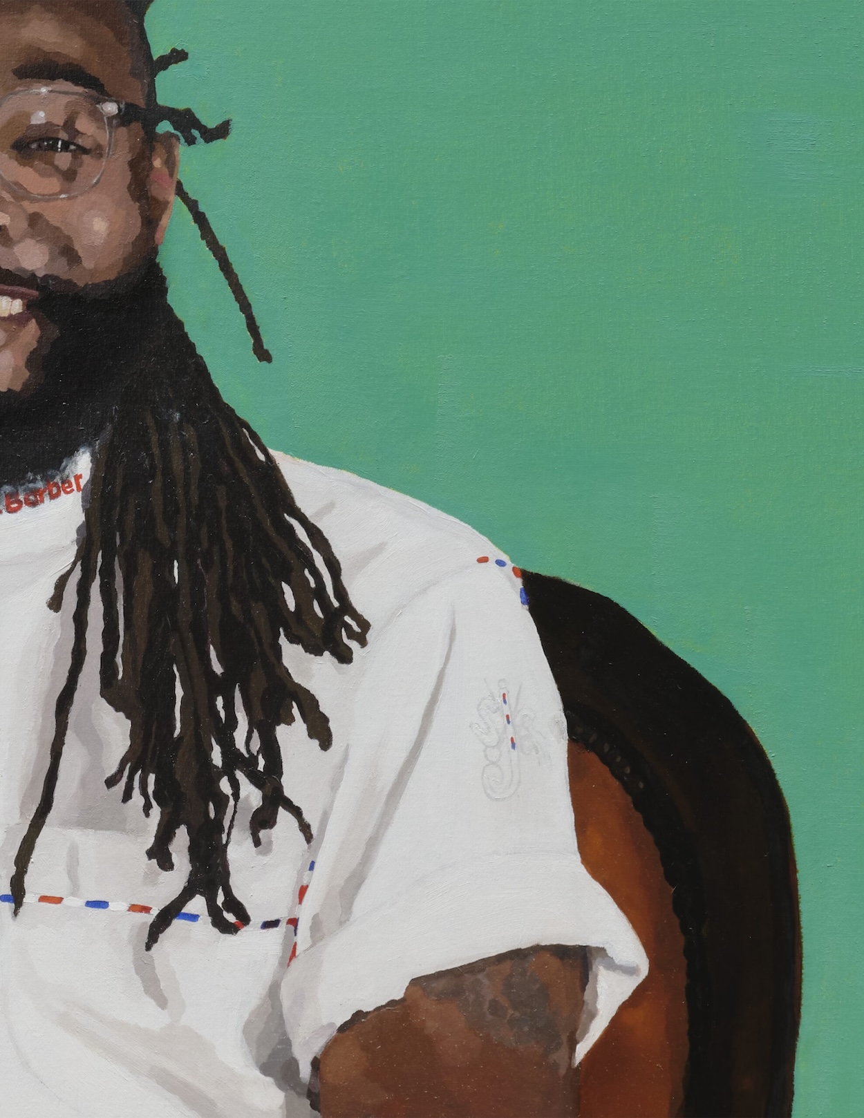 Detail view of "Sir.J", 64" x 54", oil on linen, 2024, courtesy of Cate Capshaw and Pérez Art Museum Miami.…