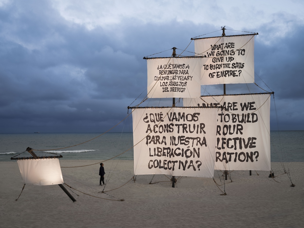 Seletega—a large-scale, site-specific commission by multidisciplinary artist Nicholas Galanin, of the Sitka Tribe of Alaska—anchors this year’s astonishing Faena Art presentation, all of which is bound by the theme of “Dismantling Empires: Reflections on Power, Belief, and Responsibility.” The sails of Galanin’s towering piece, positioned on Faena Beach, call to viewers in the distance with their messages. The sculptural work is coupled with an artistic interventionby Marina Abramovic, presented by Massimo Dutti at Faena Art Project Room. Further, this year’s Faena Art roster incorporates artist Lyra Drake’s public debut, Infinite Faith in a Finite World, at Faena Cathedreal—and a No Vacancy commission of Magnus Sodamin entitled Reflections of a Florida Wild.