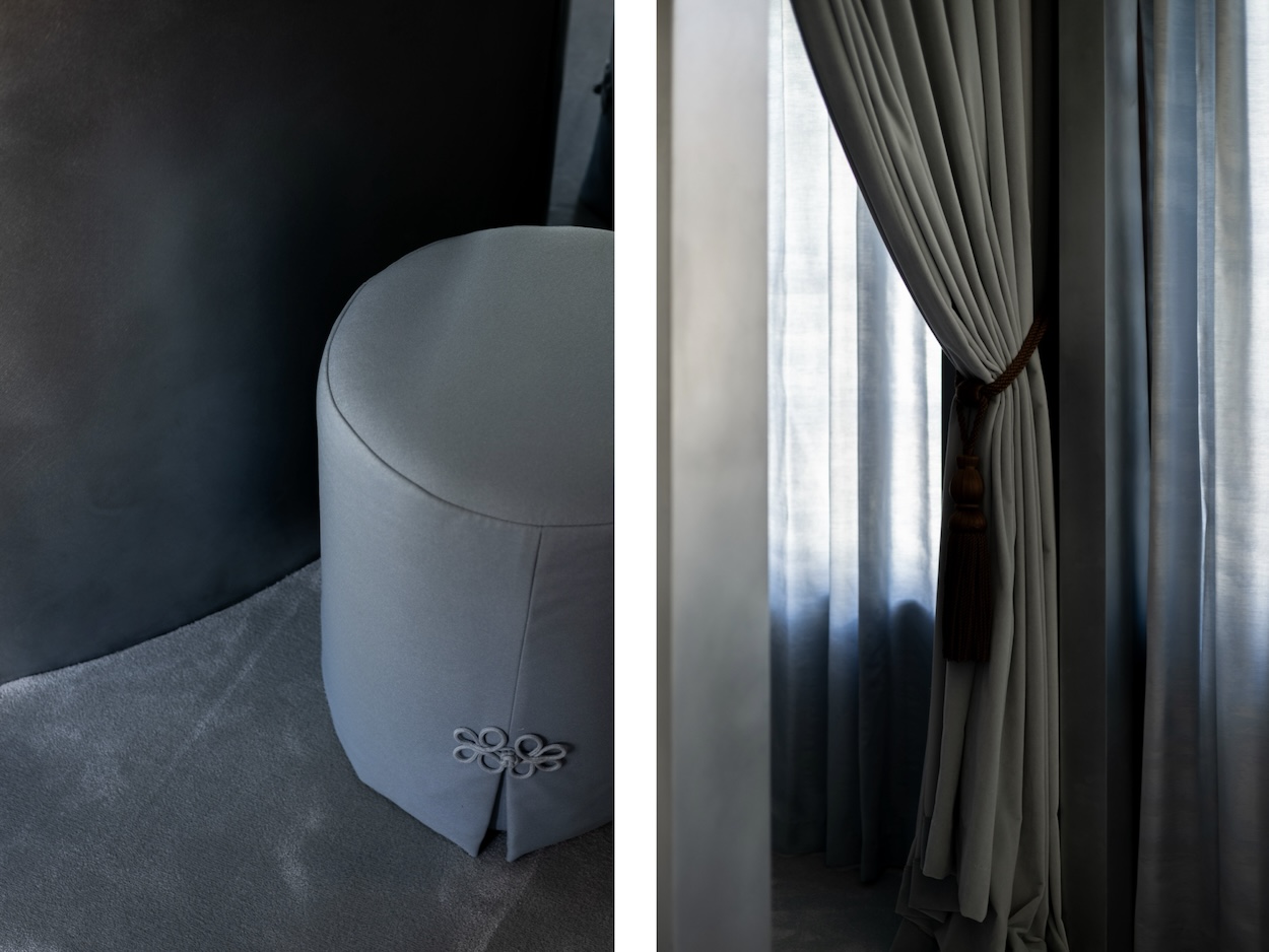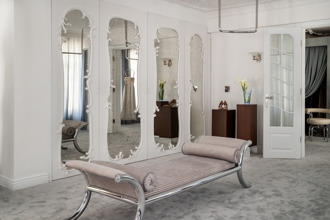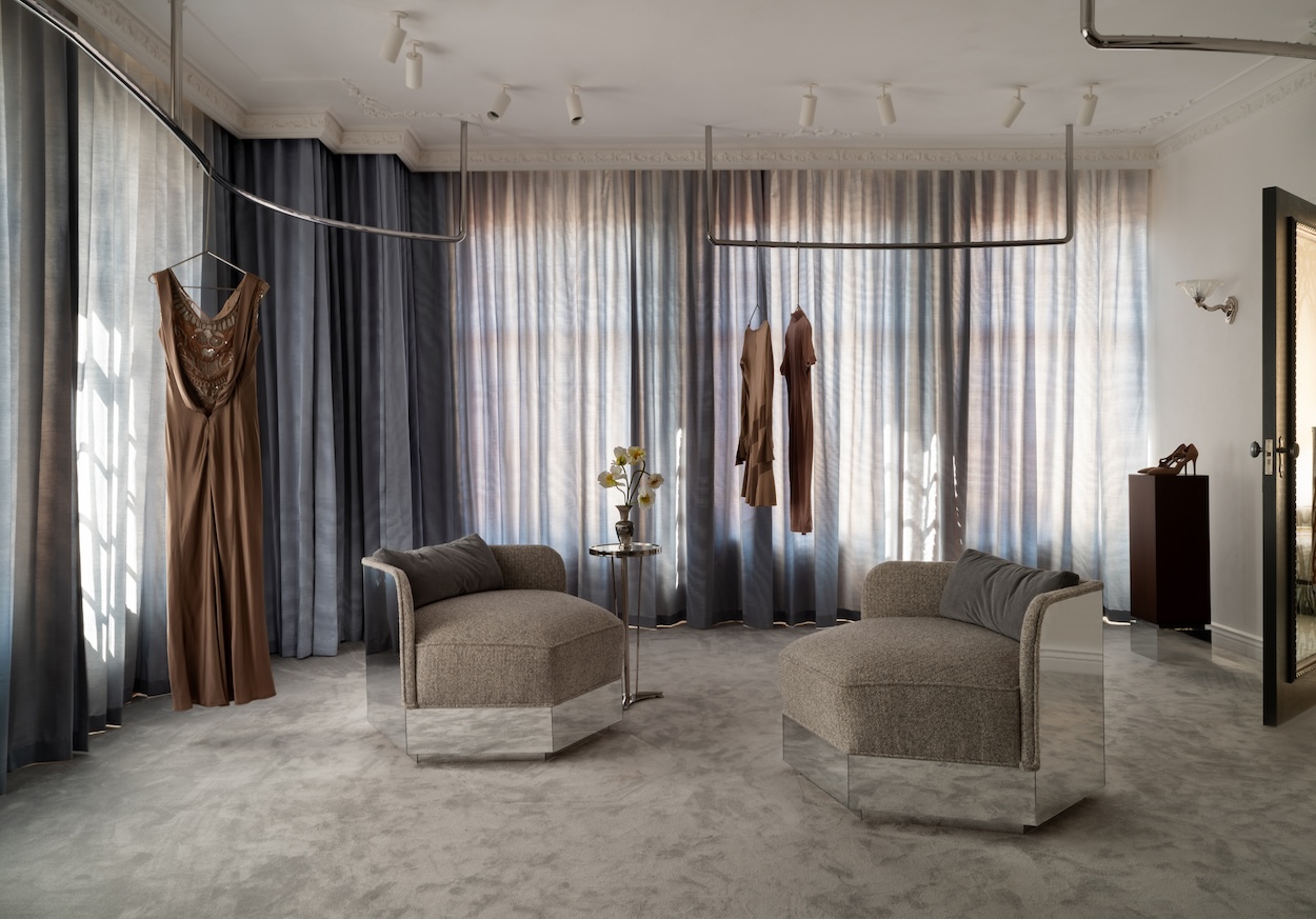 Beyond the main salon, French doors reveal a curved chrome dressing room lined with soft velvet curtains and oversized tassels. “We built a closet you can shop in—and a store you can sit on the floor in,” says Khersonsky. “That’s always my test. If you want to stay, if you want to lounge, it’s working.”