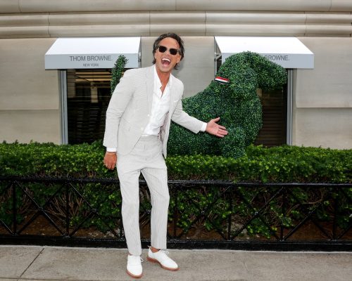 Thom Browne personally welcomed a star-studded suite of cultural figures to an intimate cocktail in celebration of his 72nd Street flagship (which houses the latest releases in his men’s and women’s ready-to-wear line) as well as its neighboring Madison Avenue boutique (his first location dedicated exclusively to leather goods and footwear). An upscale materiality graced both new spaces, furthering the elegant, orderly retail experience Browne has fostered over the years. Within the Madison Ave shop, an array of Browne’s charming animal-shaped bags joined his beloved Hector bag, inspired by the designer’s own ten-year-old, wire-haired dachshund, Hector. On 72nd Street, beyond a Hector-shaped hedge, champagne and cups of ice cream were passed to affable guests adorned in Browne’s summer curriculum and spring summer classics collections. Attendees included Celine Song, Walton Goggins, Christine Baranski, Chris Appleton, Moses Sumney, Jack Innanen, Louisa Jacobsen, Reign Judge, and more.