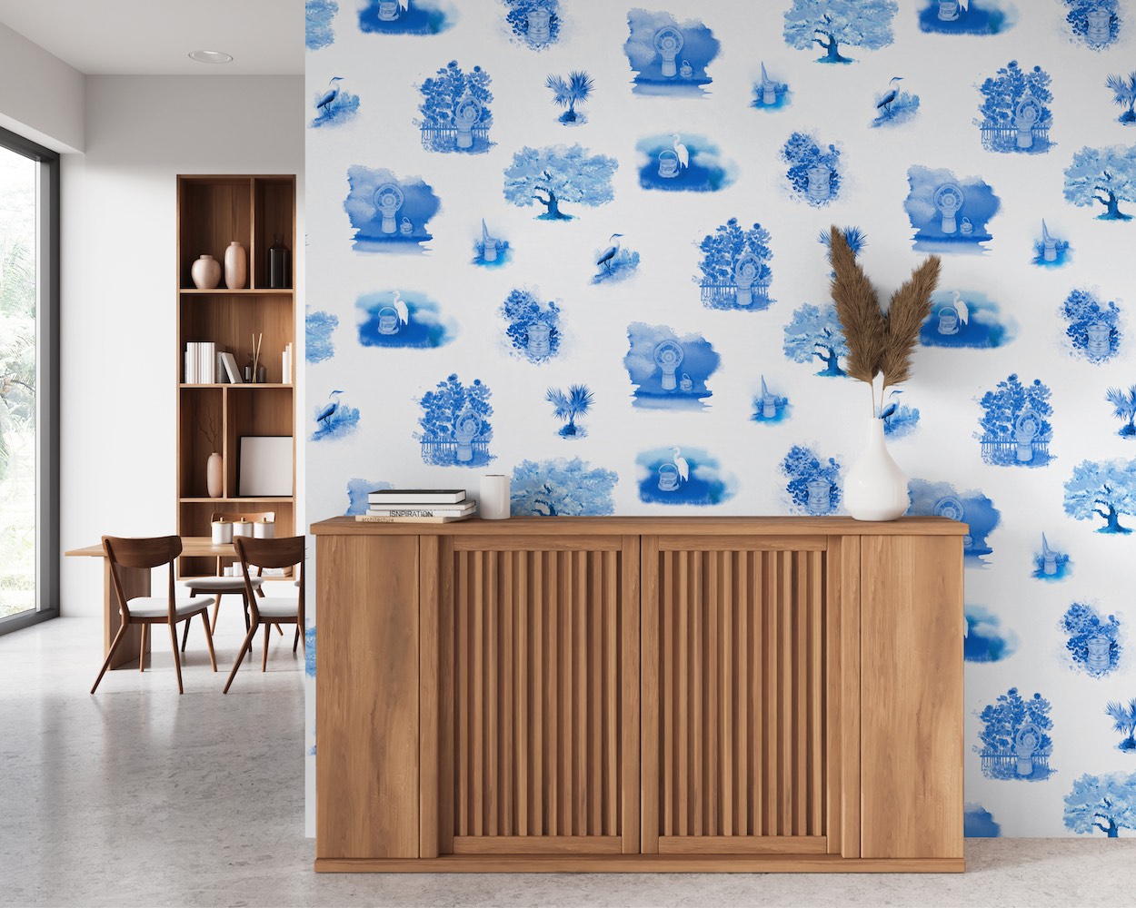 Each wallcovering tells a different kind of story. Pinwheel Fannas renders Darryl Stoneworth’s triad of pinwheel baskets at full scale, preserving their original coloration and stitchwork. Its deft mastery of craft combines aesthetic ornament with visual substance.The same goes for Princess & Queen, a toile-style design that frames Angela Stoneworth’s sculptural works within lush vignettes of palmettos, Spanish moss, and graceful marsh birds. The landscape isn’t merely a backdrop—its vibrancy commands the eye’s focus. In Shadowmaker, [which] Stoneworth’s basket rims and local ironwork are distilled into architectural motifs, then printed on Wolf-Gordon’s flax-based Rampart fiber to heighten the natural texture. And for Rhythms in the Tapestry of Time, Amiri Farris layers paint, symbols, and abstract movement into a visual language he calls “color rhythms,” grounding the work in Gullah Geechee cosmology while leaning into a distinctly contemporary expression of abstraction.