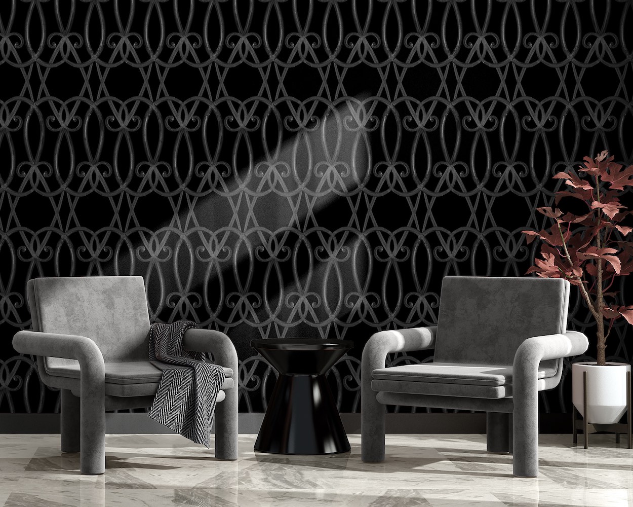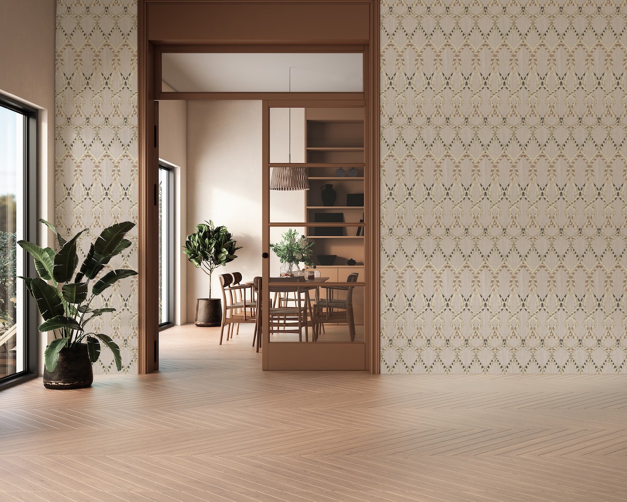 Throughout the collection, which debuted as an exhibition at the HD Expo trade show, material choice plays a quiet but pivotal role. As with previous conceptual collections, Shaw and her team developed the works to live across a variety of substrates—PVC-free wallcoverings, Mylar, felt, even protective materials like Rampart—ensuring the visual integrity of each design carries into real-world environments. But what setsBinya Comya apart isn’t just production agility or aesthetic impact. Through deeply collaborative research, tactile translation, and reverence for its subjects, Binya Comya refuses to treat heritage as ornament. Instead, it insists on heritage as a structural imperative—woven, stitched, forged, and cast into the walls themselves.