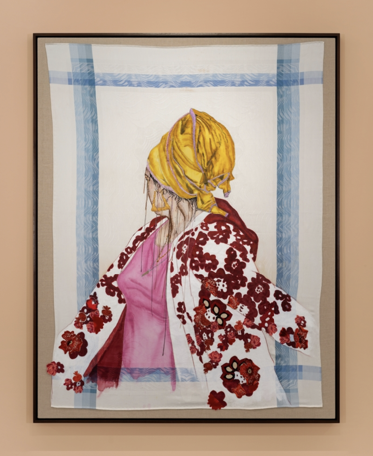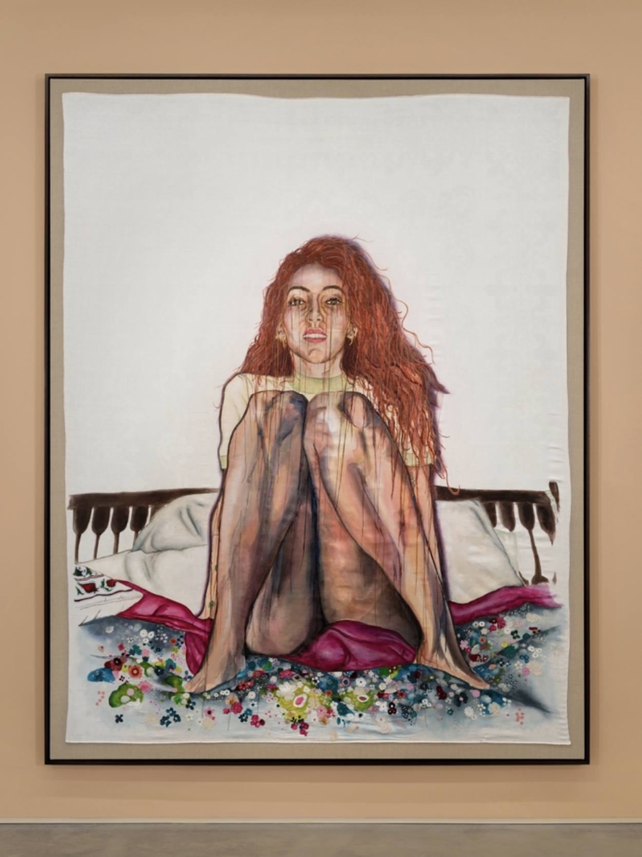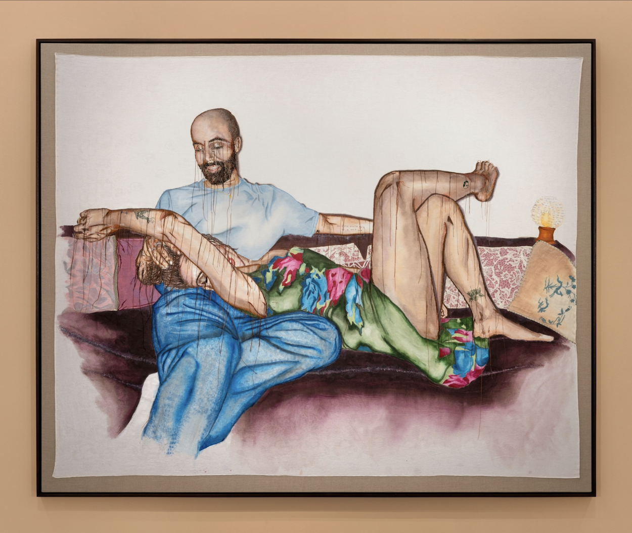 With “Who By Fire,” Brooklyn-based multidisciplinary artist Zoë Buckman makes her solo debut at Miami’s Mindy Solomon Gallery. Composed of nuanced portraiture born of textile and paint, the exhibition explores the intimacy of community, belonging, and mortality, all within domestic spaces, as the artist looks toward friends and family for inspiration and emotional resonance. It’s the latest of many milestones for the artist, who will soon see her first solo museum show, “Show Me Your Bruises, Then” at the Pérez Art Museum Miami (PAMM), and publish her first monograph, Thick Bleach & Euphemisms.