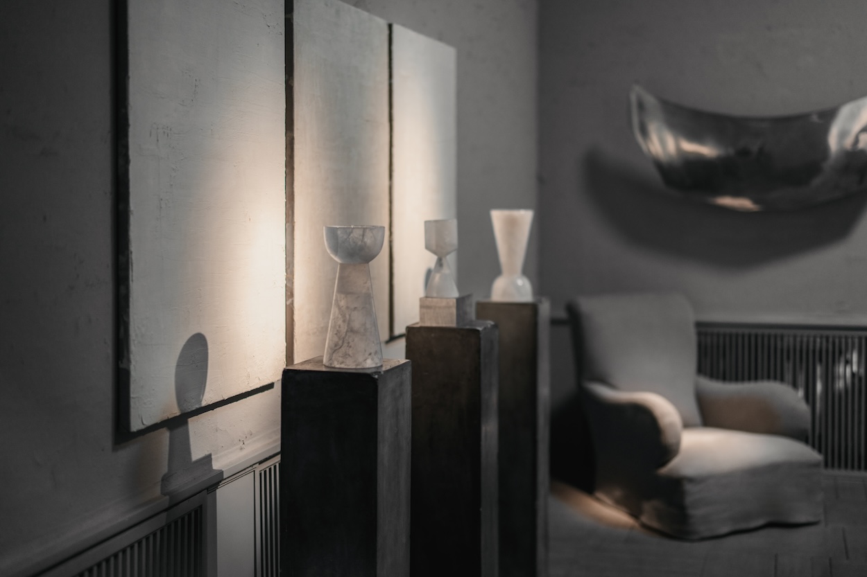 Michèle Lamy and Oliver Gustav have transformed Gustav’s 1920s-era Copenhagen studio into a tactile, immersive stage for sculptural furniture and contemporary art. The group exhibition, “Staging,” positions Rick Owens’ signature brutalist tables and sculptural pieces alongside Gustav’s long linen sofa, Kaare Golles’ aluminum forms, Scarlett Rouge’s surreal paintings, and ceramics by Giovanni Bassan, creating a dialogue between material, form, and spatial experience.