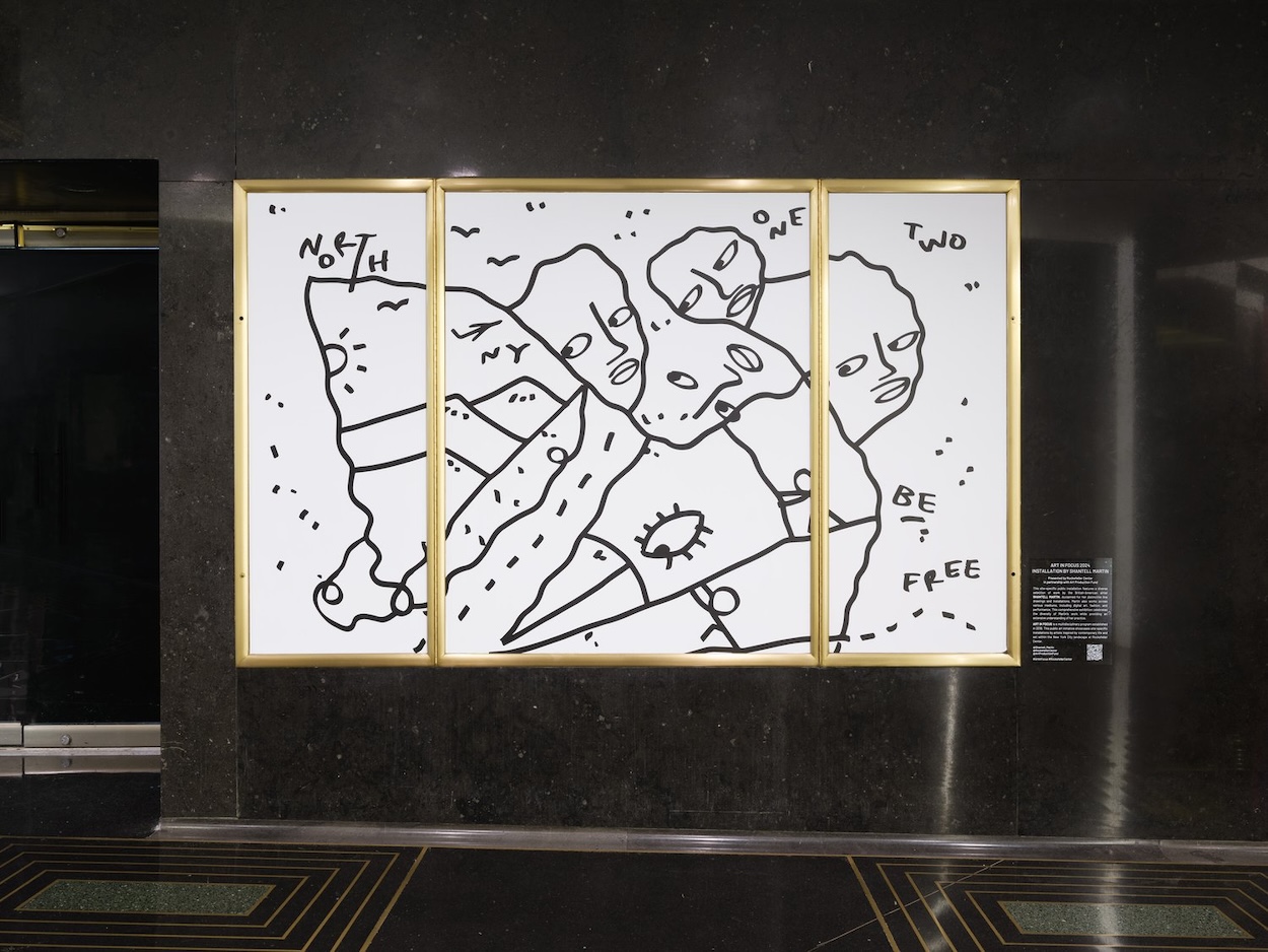 Rockefeller Center’s Art in Focus program is now showcasing the British-American artist’s spontaneous, free-flowing line drawings about our shared humanity across the complex’s public spaces. The exhibition includes a 125-foot-long mural, a display of her KOOBs series, and live drawing sessions where she creates new works in real time.